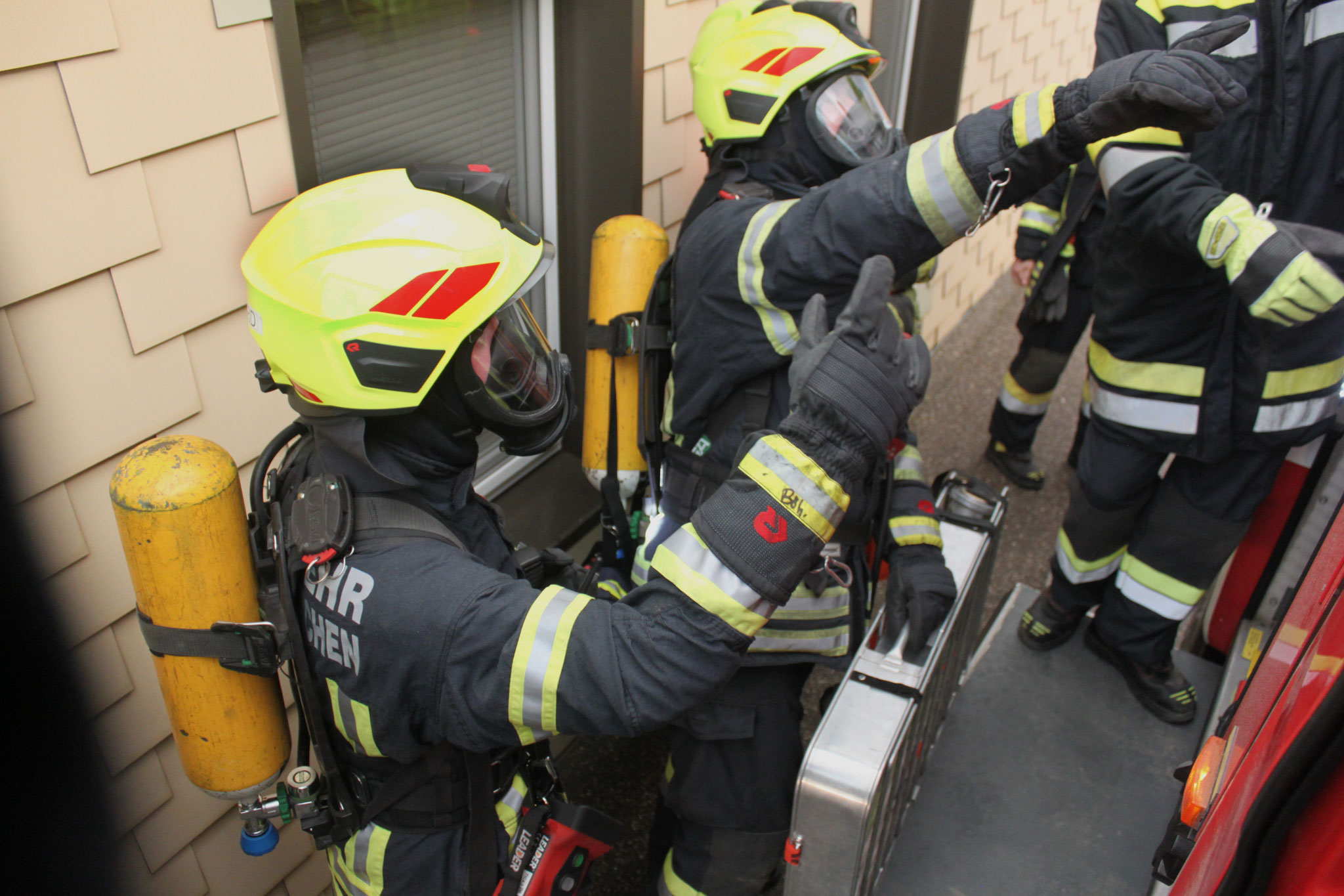 Küchenbrand mit vermissten Personen, welche mittels Atemschutz zu retten waren. In summe konnten acht Atemschutztrupps das Szenario beüben.