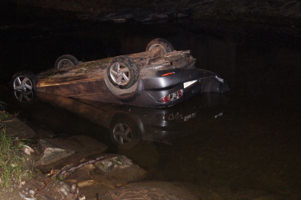 Ein PKW, welcher von der Hochfeldstraße Richtung Plosdorf unterwegs war, verpasste aus ungeklärter Ursache eine starke Rechtskurve. Der PKW stürzte samt Insassen in den Michelbach.