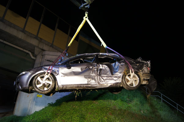 Unsere Aufgabe bestand darin, das Fahrzeug mittels unseres WLF-Krans zu bergen und auf dem gegenüberliegenden Parkplatz sicher abzustellen.