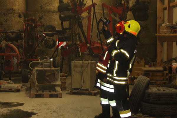 Schon bei der Anfahrt bot sich uns folgendes Bild: Eine Zelthalle, in der mehrere PKW gelagert sind, stand in Brand. Bei der Anfahrt rüsteten sich sowohl in unserem TLF, als auch im KLF je drei Atemschutzgeräteträger aus.