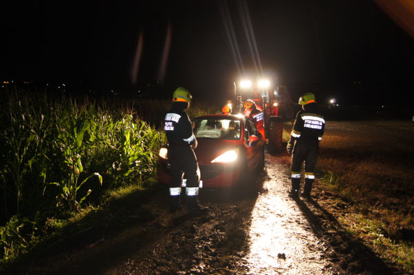 Nach der Lageerkundung stand fest, dass ein Fahrzeug von der schlammbedeckten Fahrbahn abgekommen ist. Mit Hilfe eines Traktors konnten wir, nach mehreren versuchen, das Fahrzeug aus dem Feld