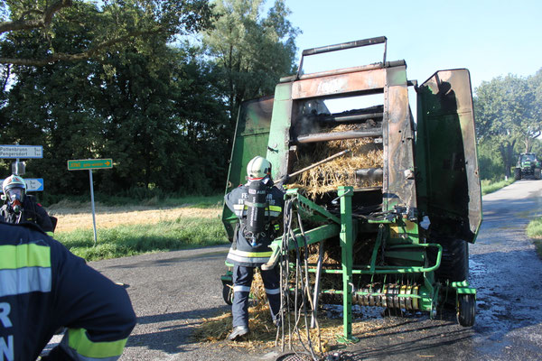 Heute 30.07.2016 wurden wir um 17:41 Uhr mit Sirene und Pager zu einem Brand einer Strohrundballenpresse auf die L5077 bei Schildberg alarmiert.