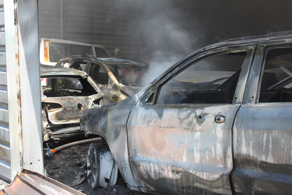 Schon bei der Anfahrt bot sich uns folgendes Bild: Eine Zelthalle, in der mehrere PKW gelagert sind, stand in Brand. Bei der Anfahrt rüsteten sich sowohl in unserem TLF, als auch im KLF je drei
