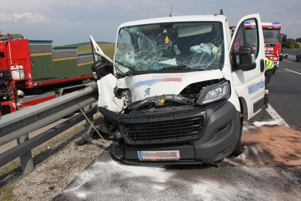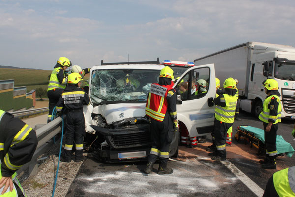 Ein Kleinbus prallte aus unbekannten Gründen gegen das Heck eines Lastwagens. Der Lenker des Fahrzeuges konnte sich selbst befreien. Der Beifahrer war aufgrund des Aufpralles im Fahrzeug