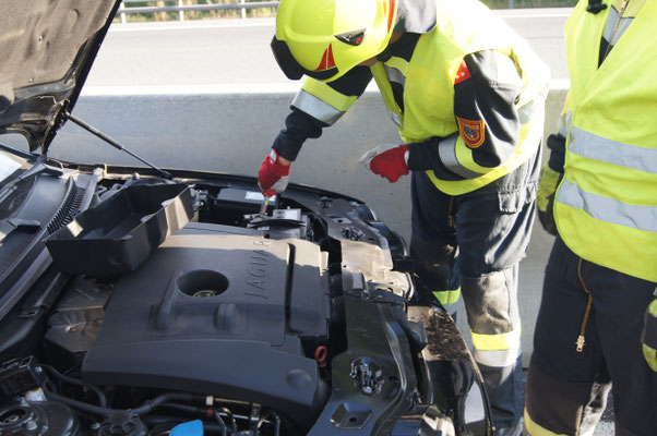 Nach der Lageerkundung stand fest, dass es sich um einen Kabelbrand im Bereich des Motors handelte. Mit dem HD-Rohr löschte der Atemschutztrupp den Brand. Anschließend wurde im gesamten Motorraum