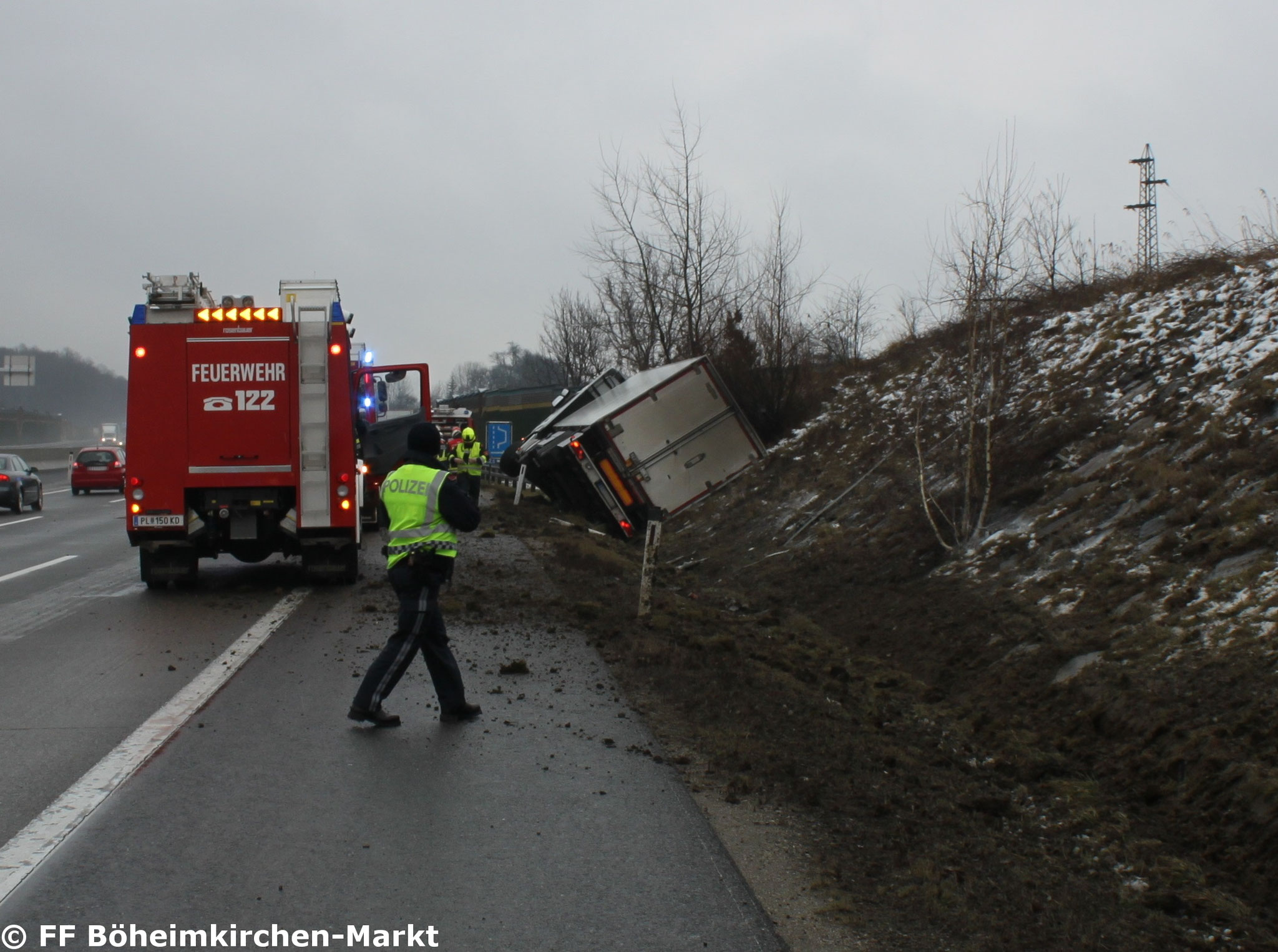 Vor Ort wurden wir vor folgendes Szenario gestellt: Ein LKW kam von der Straße ab und lag seitlich im Grünstreifen. Die Bergung führte die FF Kirchstetten-Markt gemeinsam mit einem Berge- und