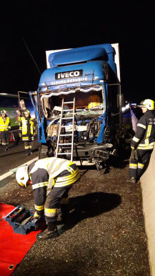 Ein LKW war aus unbekannter Ursache auf einen vorausfahrenden LKW aufgefahren. Beim Erreichen des Einsatzortes konnte durch den Einsatzleiter Entwarnung gegeben werden, da die Person „lediglich“