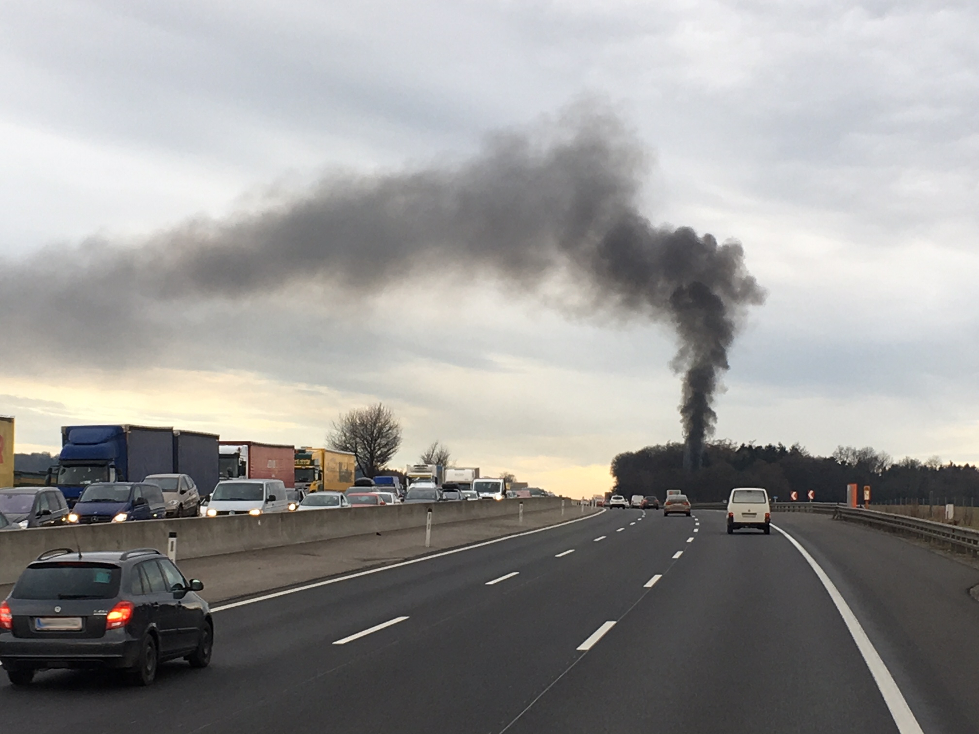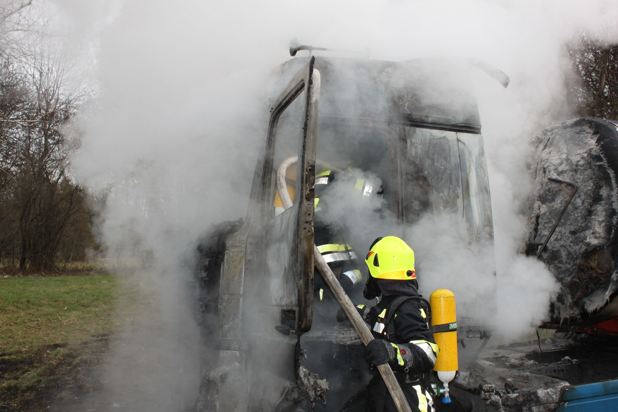 Eine starke Rauchentwicklung war schon von weitem zu erkennen. Die Zugmaschine eines Lastwagens stand in Vollbrand. Ein großflächiges Übergreifen auf den Anhänger konnte durch das schnelle