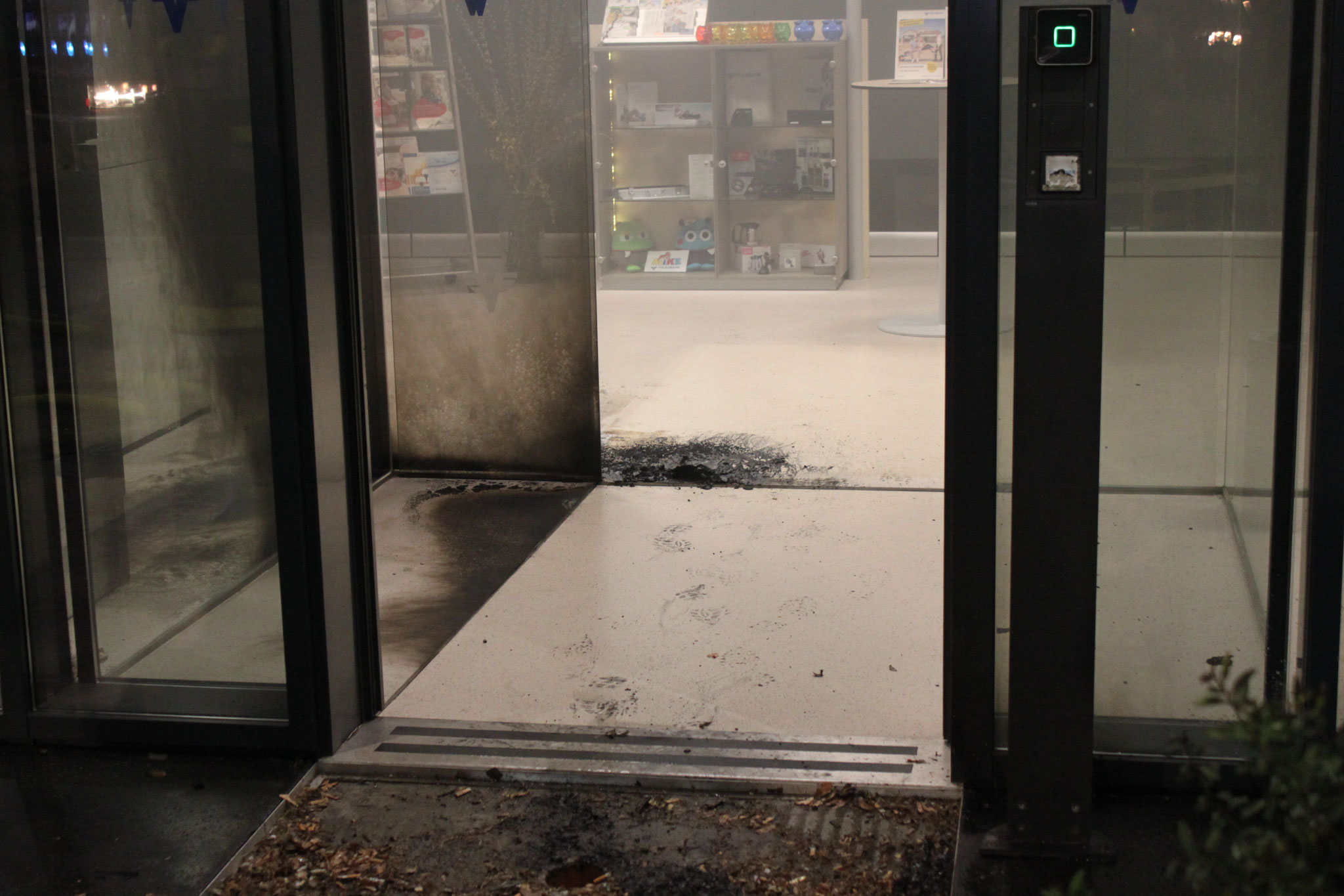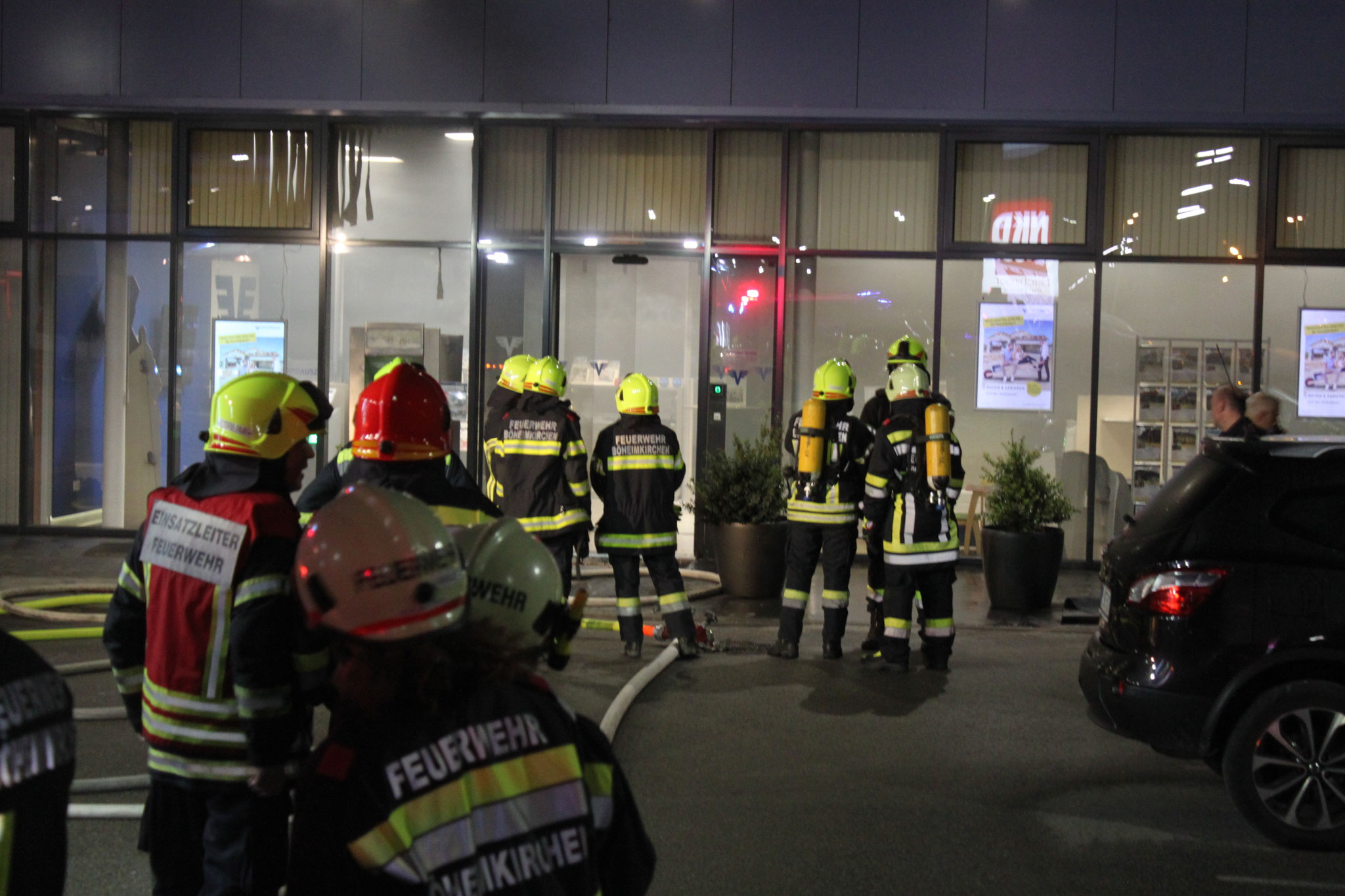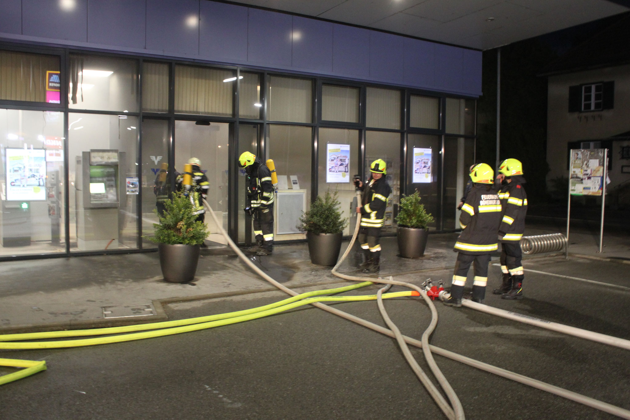 Nach dem gescheiterten Versuch den Bankomaten dieser gewaltsam zu öffnen, fing der Teppich im Foyer der Bank Feuer. Nach der Lageerkundung stand unmittelbar fest, dass ein Eingreifen der weiteren Feuerwehren nicht nötig ist.