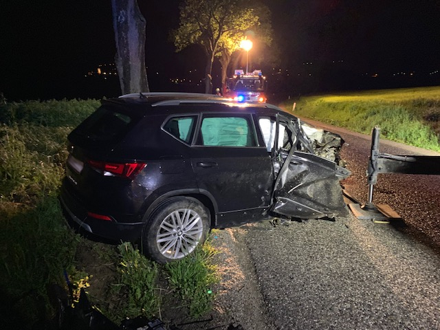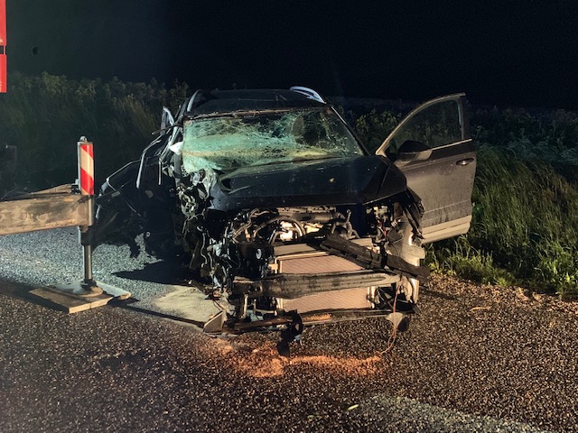Beim Eintreffen bot sich uns folgendes Szenario: Ein schwer beschädigtes Fahrzeug stand auf der Fahrbahn, es wurden keine Personen im PKW eingeschlossen.