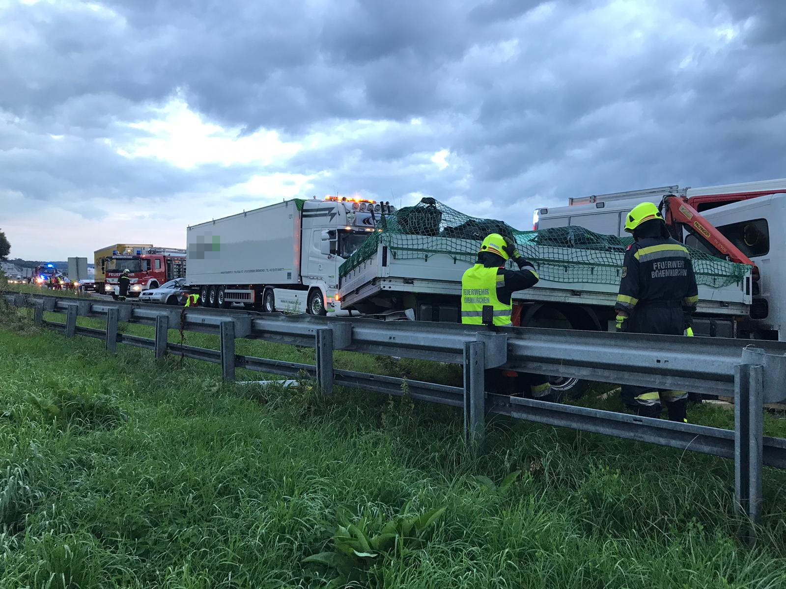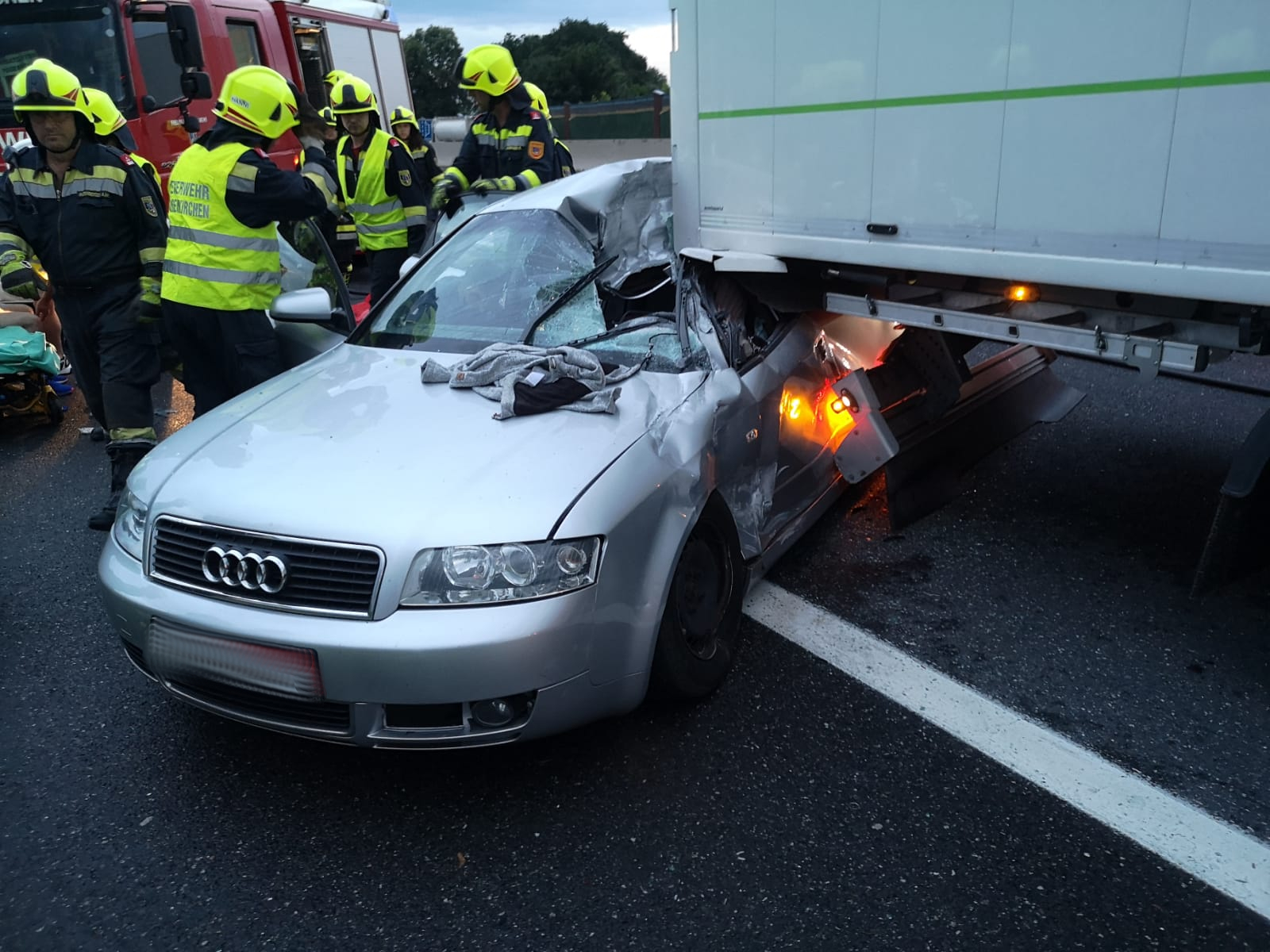 Ein PKW fuhr auf einen LKW auf, wodurch eine Person im Fahrzeug eingeschlossen wurde. Die Aufgabe der Wehren bestand darin, die eingeschlossene Person mittels hydraulischem Rettungsgerätes aus