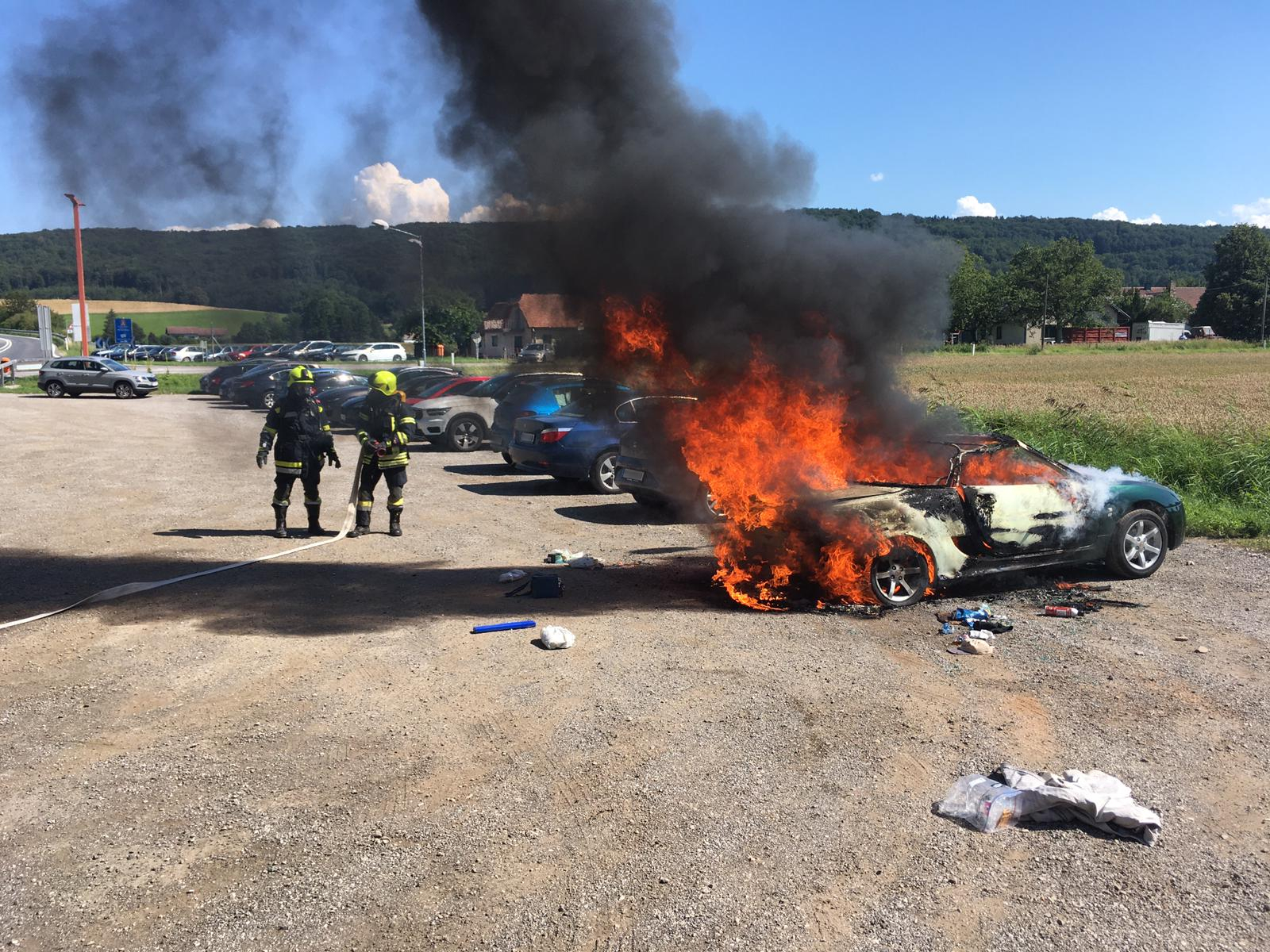 Beim Eintreffen am Einsatzort bot sich uns folgendes Szenario: Ein PKW stand in Vollbrand, der Brand drohte auf weitere Fahrzeuge überzugreifen.