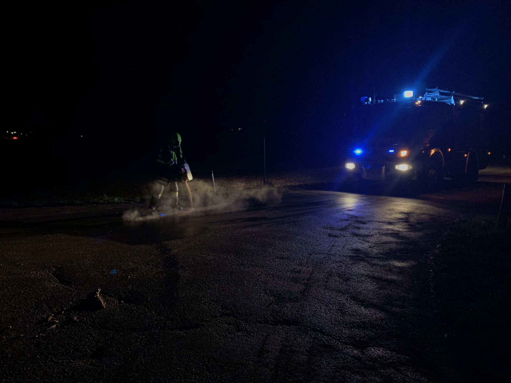 Die Aufgabe unserer Wehr bestand darin, eine Ölspur im Kreuzungsbereich bei Lanzendorf mittels Ölbinder zu binden. Der Einsatzbereich wurde für die Dauer der Arbeiten entsprechend abgesichert.
