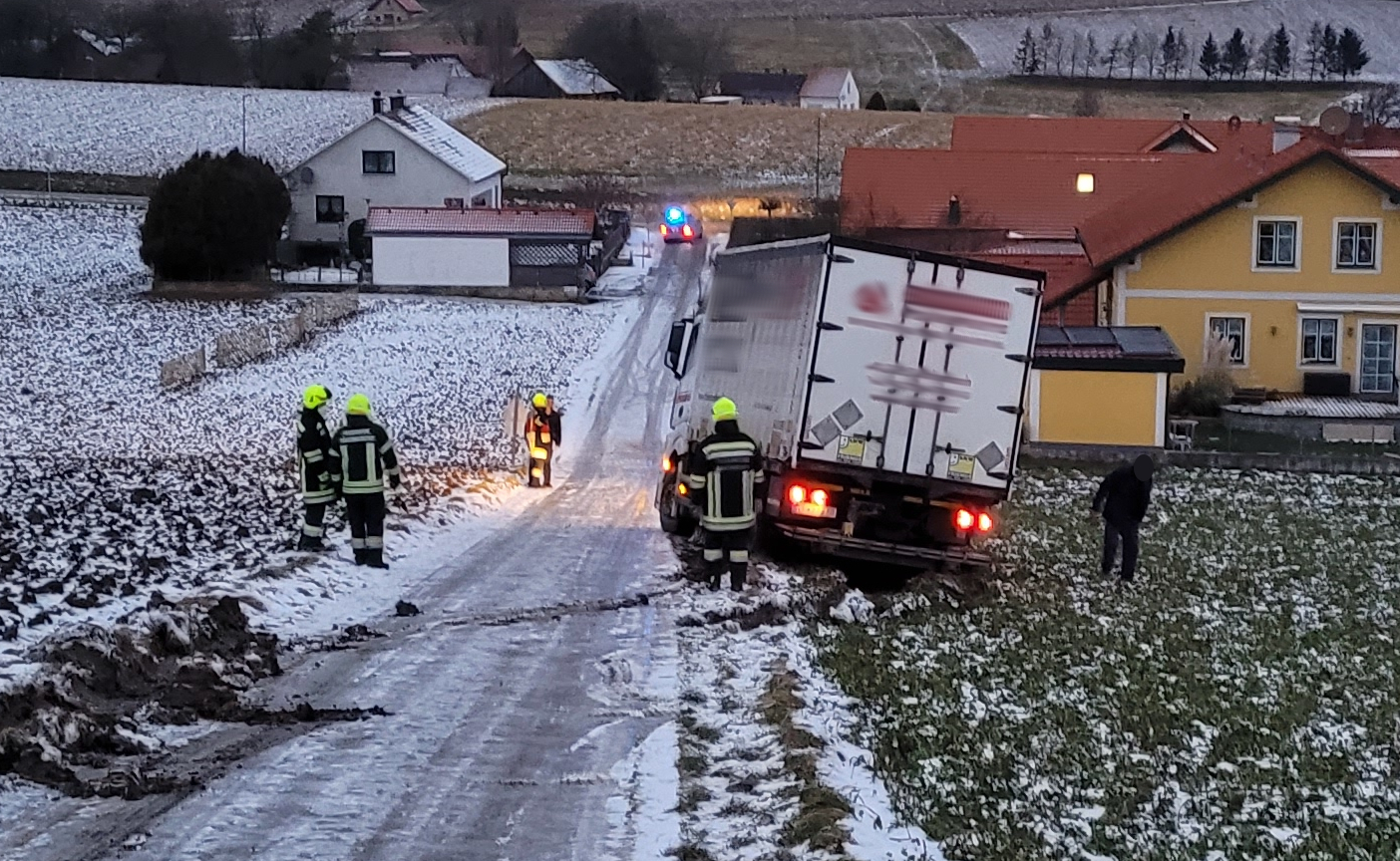 Ein LKW ist von der Straße abgekommen und steckte im Acker fest.