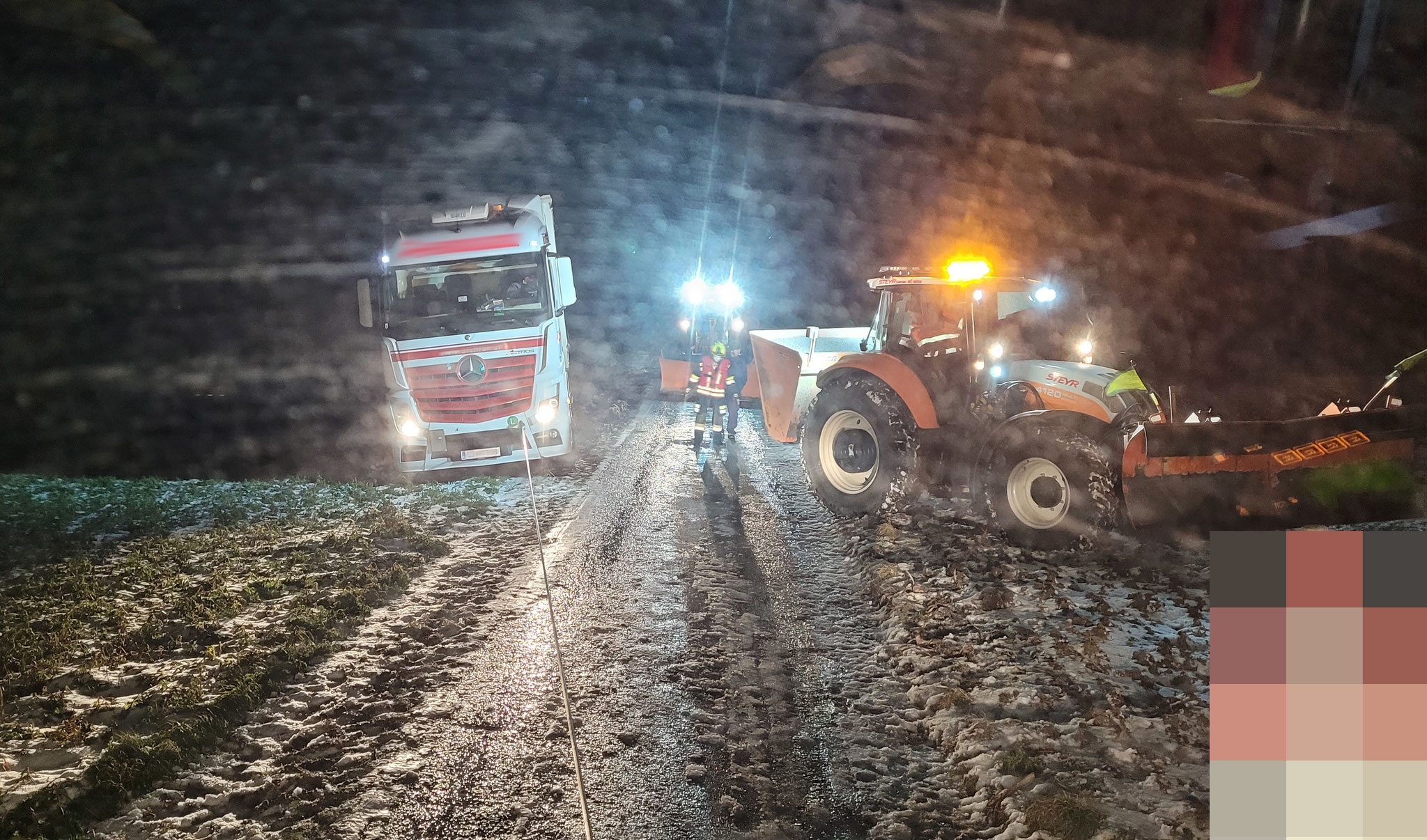 Die Aufgabe unserer Wehr war es, den LKW wieder zurück auf die Fahrbahn zu ziehen. Mit Unterstützung eines Traktors der Gemeinde wurde der LKW mittels Seilwinde geborgen.