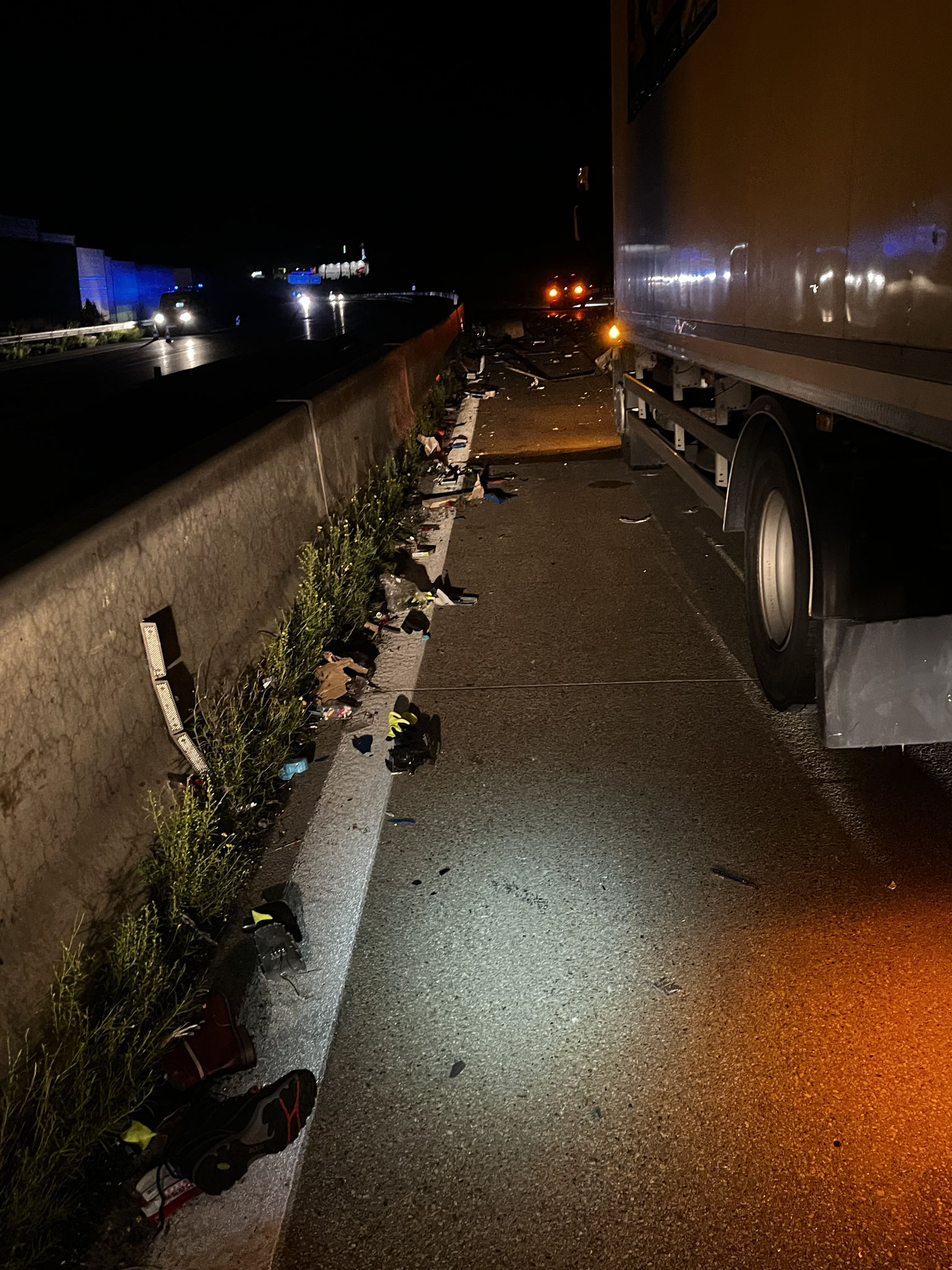 Ein PKW ist auf der 3. Spur auf einen PKW Anhänger aufgefahren. Der Anhänger löste sich vom Zugfahrzeug, überschlug sich mehrfach und blieb stark deformiert liegen, das Ladegut verteilte sich