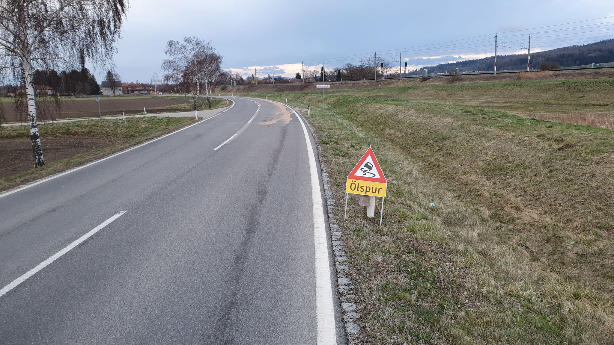 Es wurde, wo erforderlich Ölbindemittel aufgebracht und durch die Straßenverwaltung wurden entsprechende Warnschilder aufgestellt. Das Aufbringen des Ölbinders gestaltete sich beim herrschenden