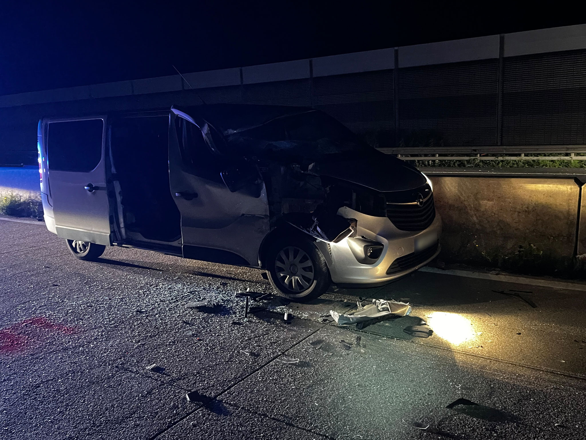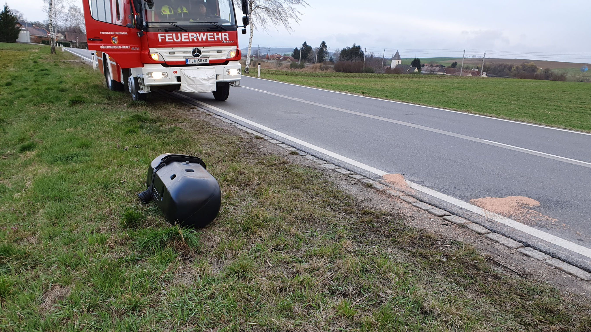 über die gesamte Fahrbahn. Ein nachkommender LKW konnte rechtzeitig bremsen, jedoch fuhr der darauffolgende Kleinbus auf den LKW auf und wurde stark beschädigt.
