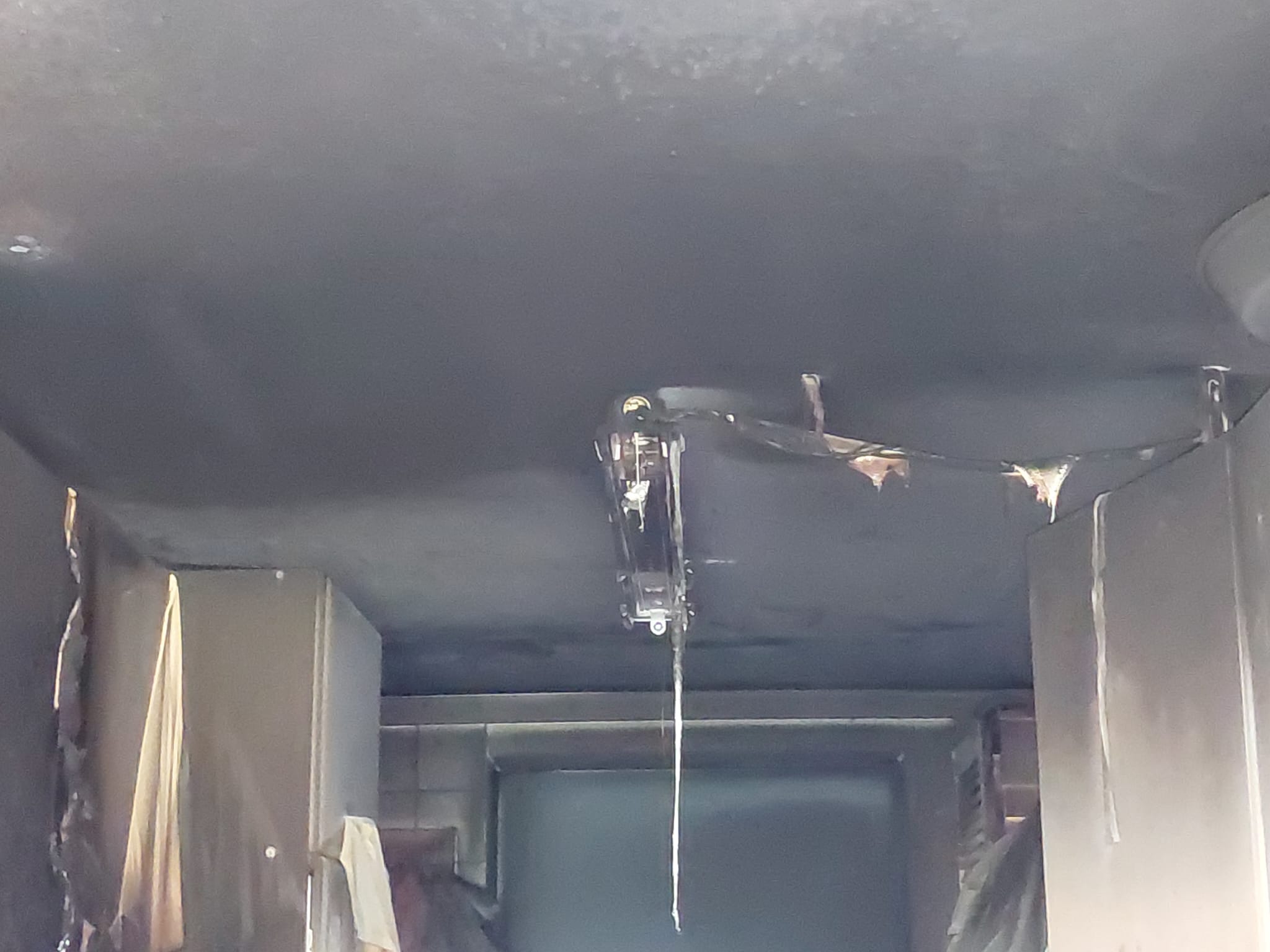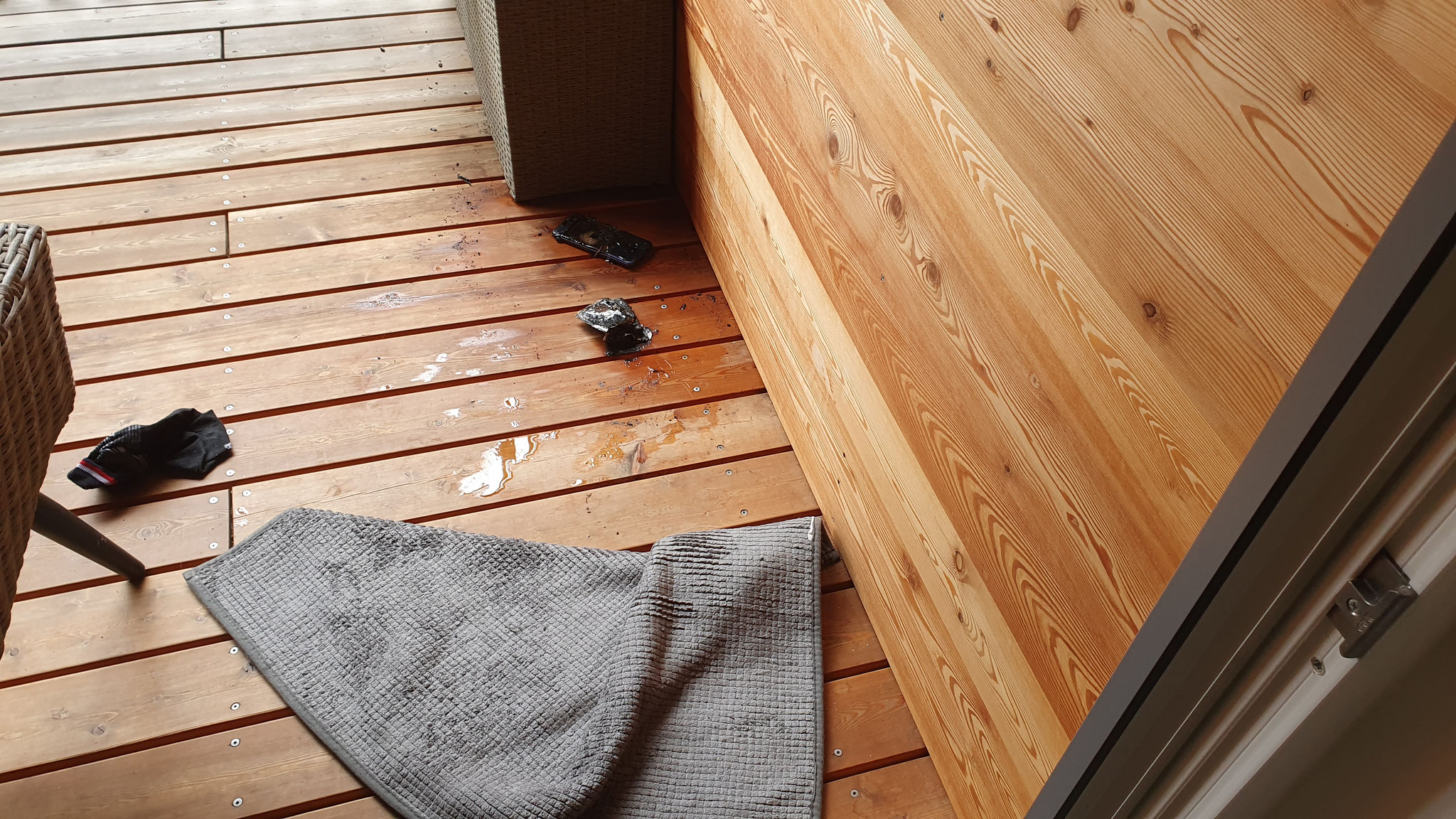 Bei unserem Eintreffen hatte der Besitzer den Brand bereits gelöscht und den rauchenden Handyakku auf den Balkon verbracht.