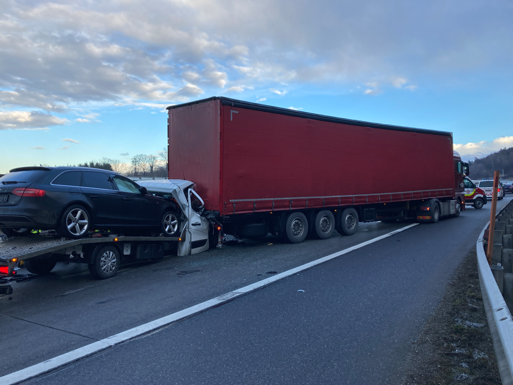 transportierten PKW von hinten ihn den Klein-LKW, wodurch der Lenker schwere Verletzungen erlitt.