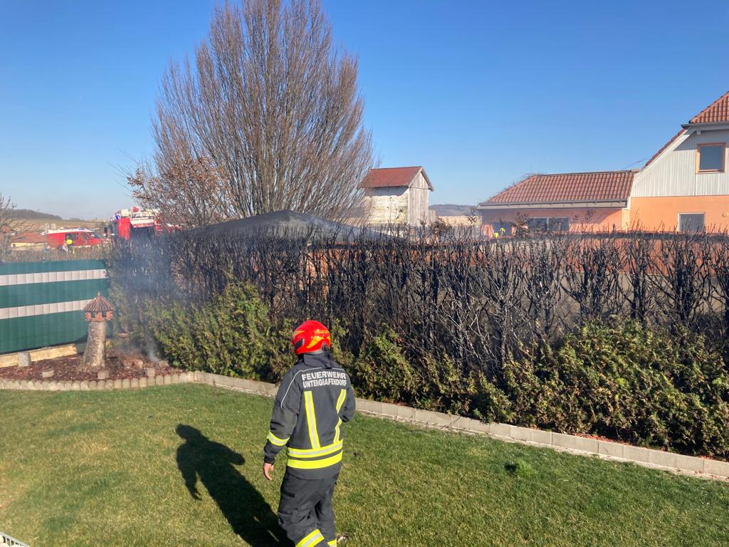 Durch den zuständigen Einsatzleiter der FF Untergrafendorf wurden wir zum Löschen der Gartenhütte und der angrenzenden Hecke, die ebenfalls bereits Feuer gefangen hatte, eingeteilt. Durch das