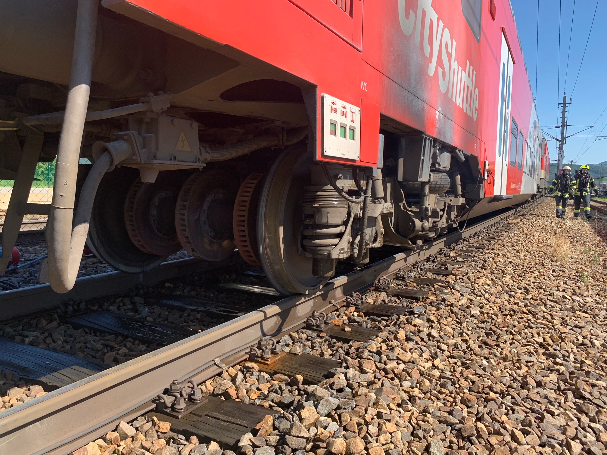 Unser Einsatzleiter ist mit dem MTF vorausgefahren und fand beim Eintreffen folgende Lage: Rauchentwicklung im Bereich der Drehgestelle des Steuerwagens eines Zuges auf Überstellungsfahrt (=ohne
