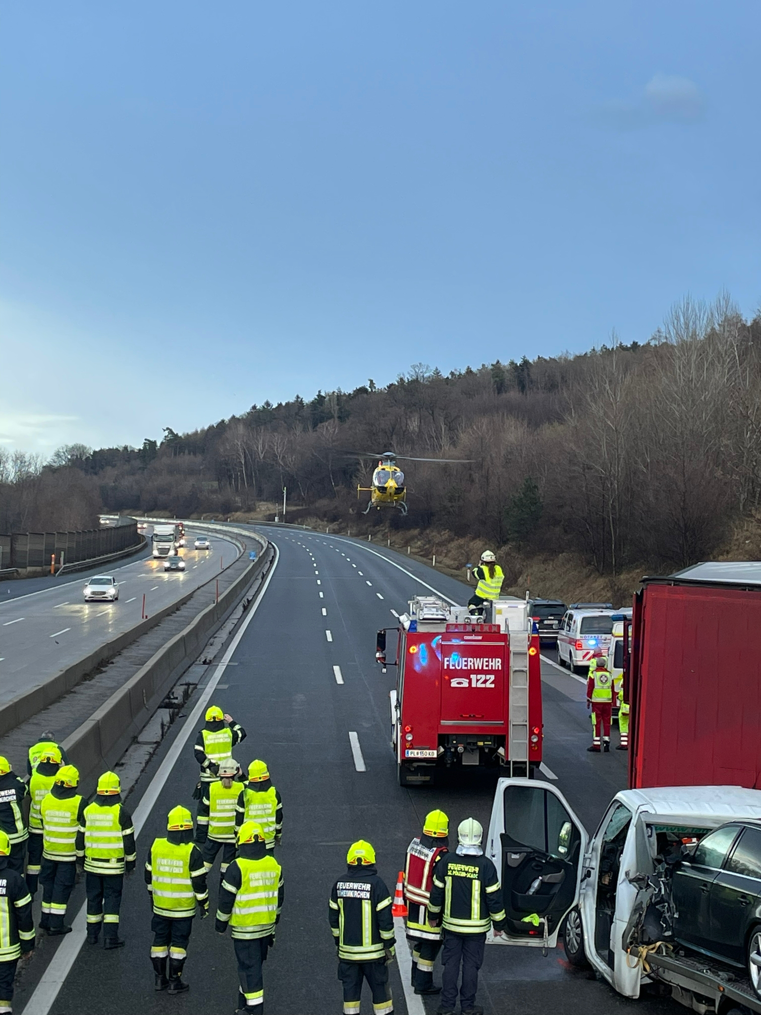Das Rüstfahrzeug konnte als erstes Fahrzeug innerhalb von wenigen Minuten ausrücken und zur Unfallstelle fahren. Bei der Anfahrt wurde die Einsatzstelle auf „Fahrtrichtung Wien, knapp vor
