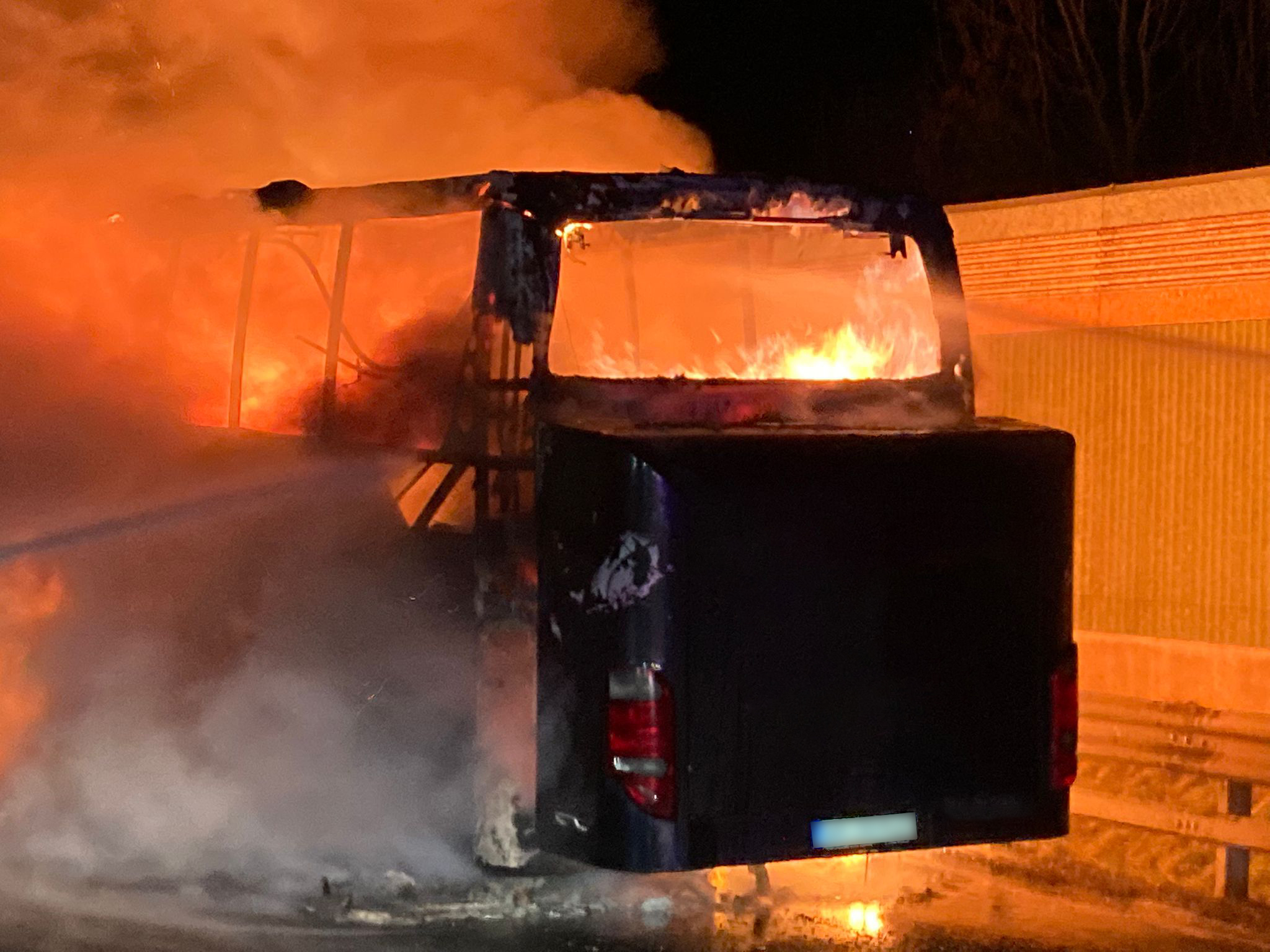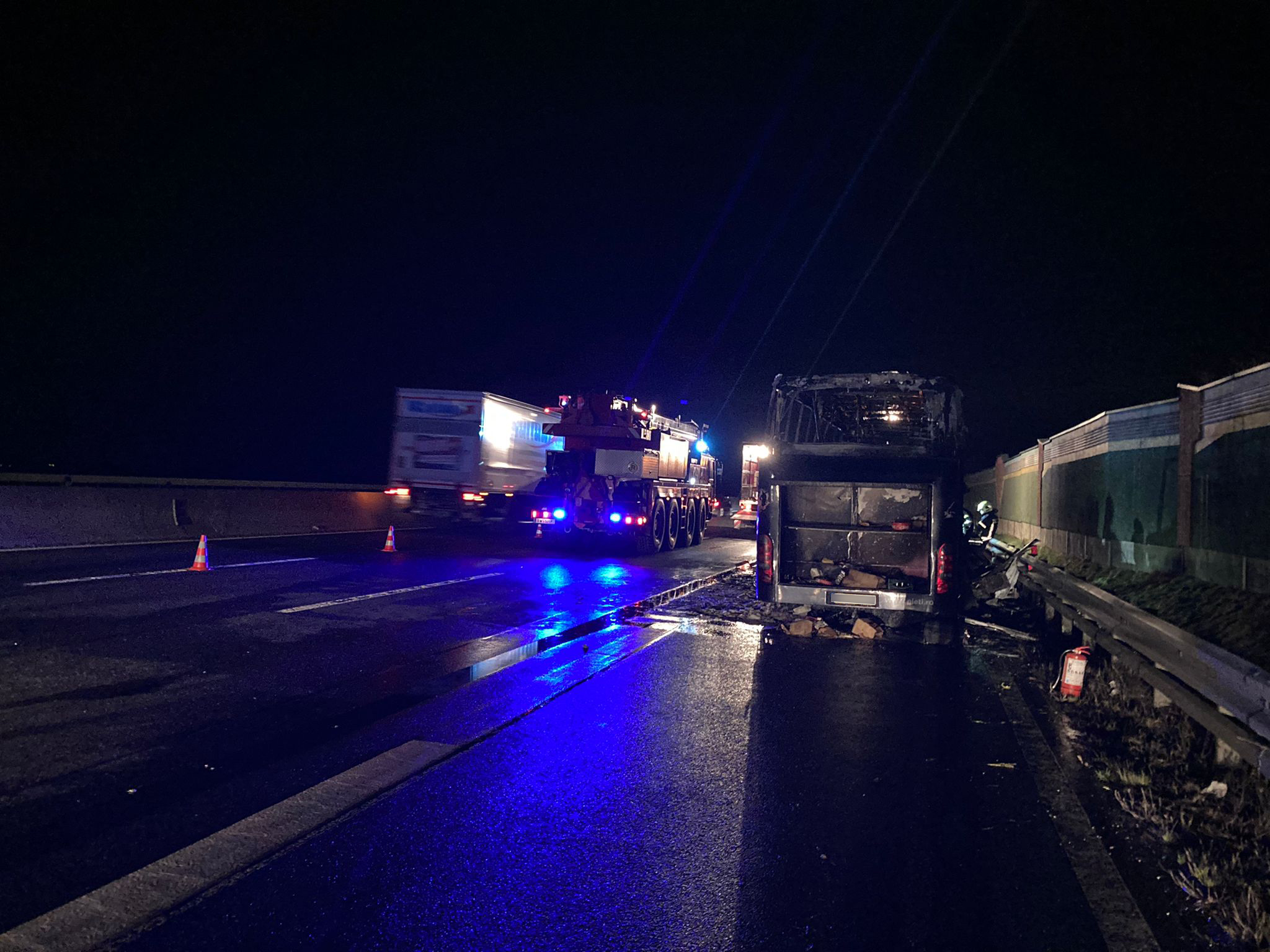 Der Vollbrand des Autobusses erzeugte große Strahlungswärme und neben den eigentlichen Löscharbeiten am Fahrzeug musste auch die Infrastruktur der Autobahn gekühlt werden.