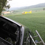 Sofort wurden sämtliche Utensilien für eine Menschenrettung vorbereitet, da das Fahrzeug drohte, in den angrenzenden Acker zu stürzen. Der Einsatzleiter konnte aber kurz nach seiner Erkundung Entwarnung geben: keine eingeklemmten Personen mehr im Fahrzeug!