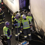 An der Unfallstelle angekommen, bot sich uns folgendes Bild: ein Transporter war auf einen Schwertransporter aufgefahren und war in seinem Fahrzeug eingeklemmt.