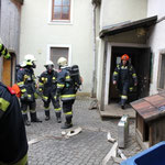 Sofort rückten TLF und KLF vollbesetzt zur Einsatzadresse aus. Aus dem Nebengebäude eines Wohnhauses schlugen weithin sichtbare Rauchsäulen aus dem Dach. Sämtliche Atemschutzgeräteträger wurden ausgerüstet und zum Sammelplatz, der bereits von der Feuerwehr Kirchstetten aufgebaut wurde, geschickt.