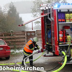 Unsere Wehr stellte sofort einen Atemschutztrupp bereit, der unverzüglich den Innenangriff begann. Schon nach kurzer Zeit konnte Entwarnung gegeben werden: eine Filmsammlung sowie ein Rucksack hatten neben dem Ofen im Obergeschoss Feuer gefangen, welches jedoch vor unserem Eintreffen bereits größtenteils gelöscht werden konnte.