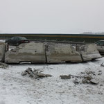 Ein LKW brach auf der schneeglatten Fahrbahn aus und rammte einen PKW, der neben ihm auf der Spur fuhr, mit und krachte mit voller Wucht durch die Betonleitwand.
