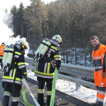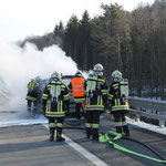 Als wir an der Unglücksstelle ankamen, stand das Führerhaus des Fahrzeuges bereits in Vollbrand. Da sich ein vollständiger Atemschutztrupp, bestehend aus drei Mann, bereits während der Fahrt ausgerüstet hatte, konnte mit der Schnellangriffseinrichtung sofort mit einem Schaumangriff begonnen werden. Durch die Wärmebildkamera konnte ein gezielter Einsatz des Löschmittels vorgenommen werden und der Brand rasch unter Kontrolle gebracht werden. Kleinere Hitzeherde wurden ebenfalls mit der Kamera aufgesucht und abgelöscht, sodass nach kurzer Zeit "Brand aus" gegeben werden konnte. Der Fahrer des Lastwagens konnte sich rechtzeitig in Sicherheit bringen und blieb unverletzt. Warum der Brand ausbrach, ist nicht geklärt.