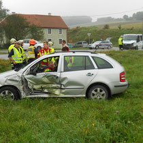 An diesem Vormittag wurden wir zu einer Fahrzeugbergung auf die L110, zur Kreuzung Richtung Wiesen, alarmiert. Ein PKW war mit einer Pritsche kollidiert und stand im angrenzenden Acker. Die Lenkerin des Autos befand sich noch im Fahrzeug.
