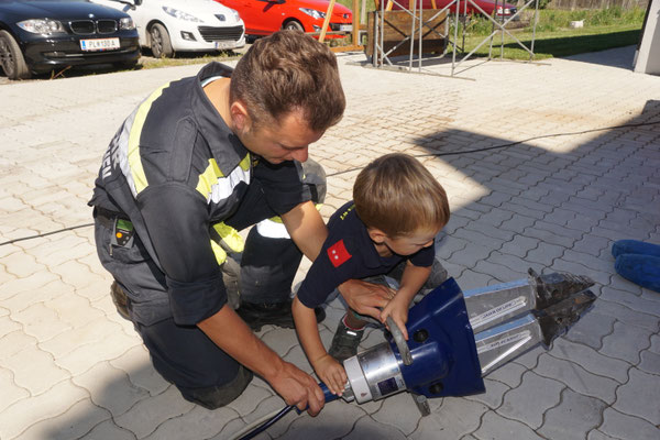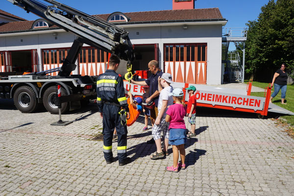 Alle Gerätschaften fürs richtige Löschen, das  technische Equipment bis zum Arbeiten mit dem Kran konnten alles ausprobiert und getestet werden.  So konnten die Kinder eine verletzte und eingeklemmte Person mittels Hebekissen unter einer LKW-Mulde rasch retten.