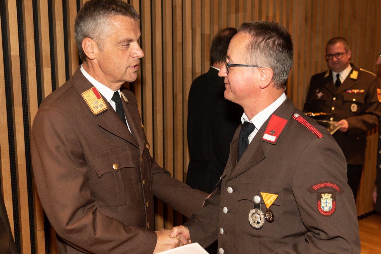 und die Gemeindevertretung (Bgm. Johann Hell und Vzbgm. Franz Gugerell) gratulierten den 2. Kommandantstellvertreter und den nunmehrigen Ehrendienstgradträgern.