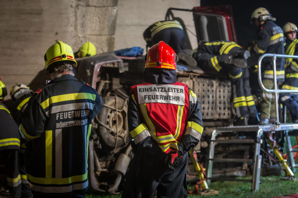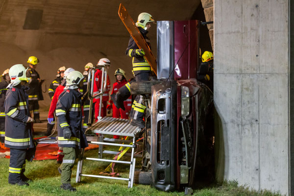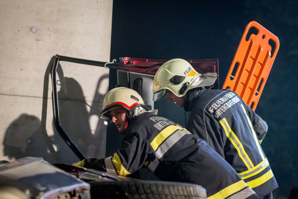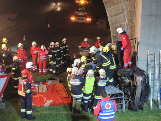 Am Übungsort eingetroffen, erhielt das RF-S Böheimkirchen vom Roten Kreuz genauere Information zum Unfall: Ein PKW liegt auf der Seite, drei verletzte Personen befinden sich im Fahrzeug.