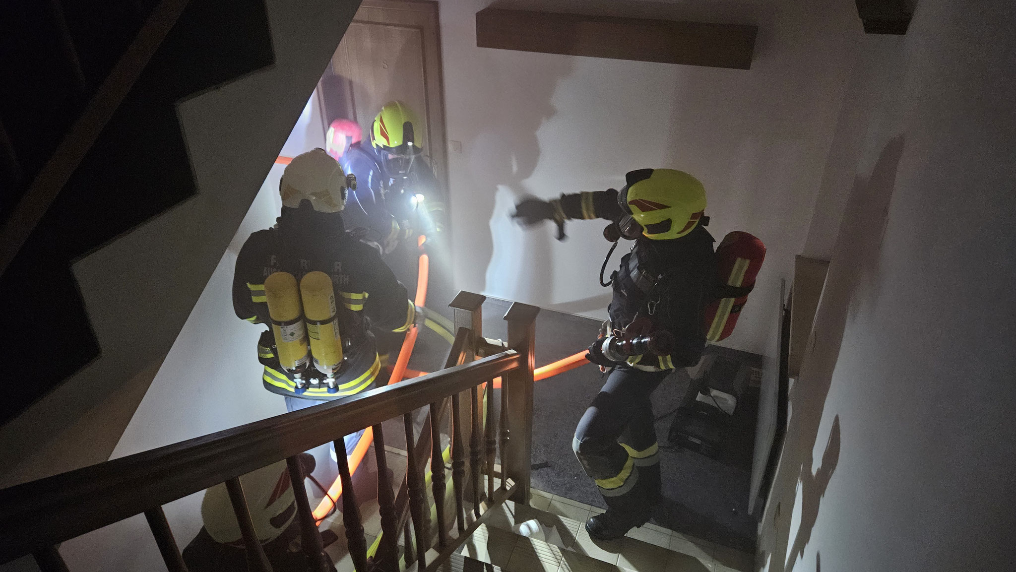 Schläuchen im Stiegenhaus und Brandbekämpfung mit Wasser im Innenbereich, beüben. Zusätzlich wurden die versperrten Zimmertüren mit verschiedenen Hilfsmitteln aufgebrochen und somit ein Vergleich