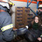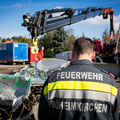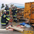 Parallel wurde ein Übungszenario dargestellt, bei der eine Person unter einem Container eingeklemmt war. Diese wurde mithilfe von verschiedenen Hilfsmitteln unter dem Container hervorgebracht und