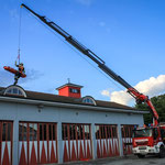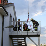 Für die weiteren Löschmaßnahmen wurde unter Atemschutz eine Dachöffnung mit der Motorsäge geschaffen und mit dem Arbeitskorb und dem WLF ein Außenangriff gestartet.