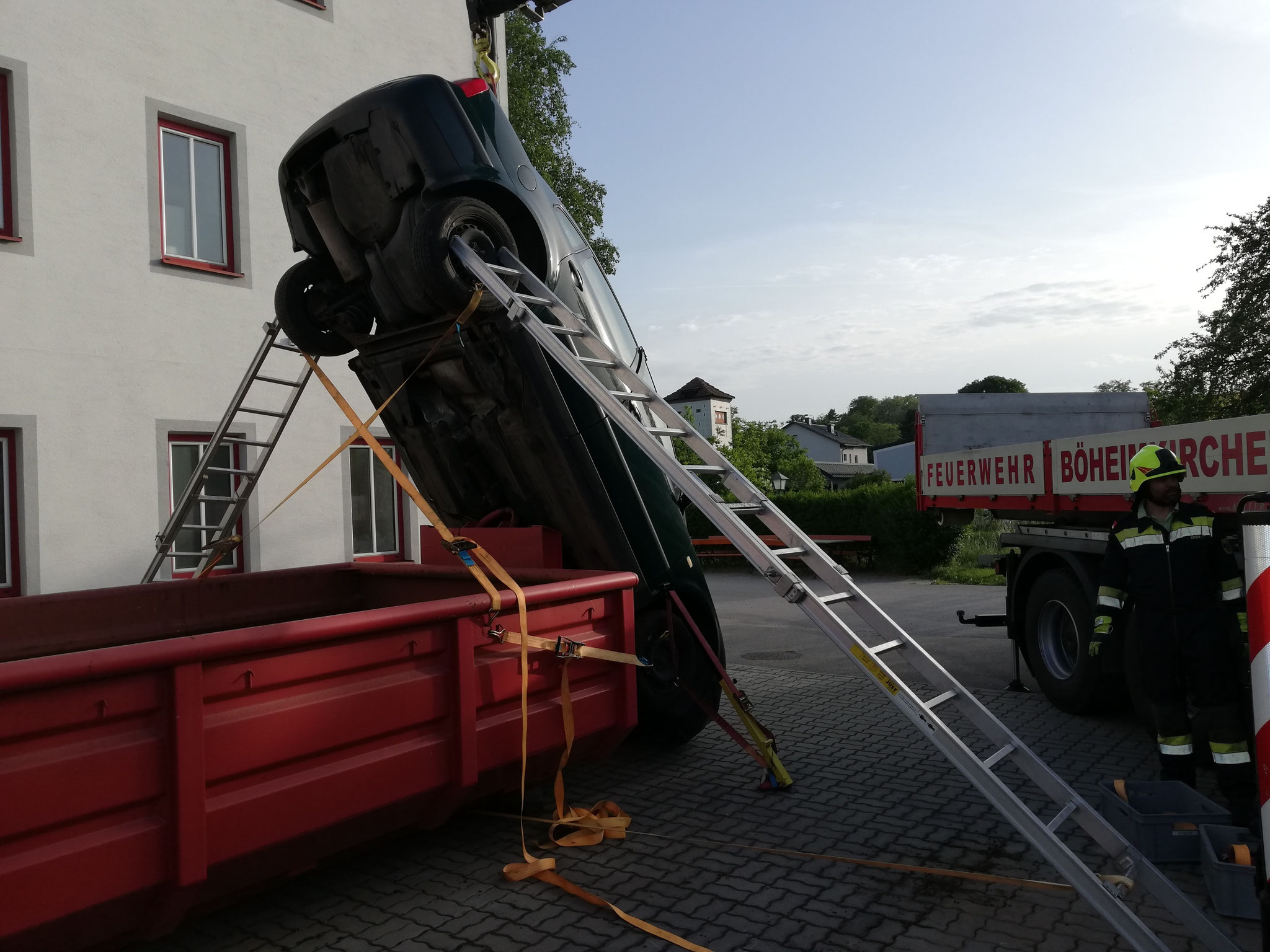 und rechts an den Radläufen angebracht, zwei Leitern wurden als Stützen in das linke und rechte Hinterradhaus gesteckt und mit Spanngurten gesichert. Zusätzlich wurden mithilfe von zwei