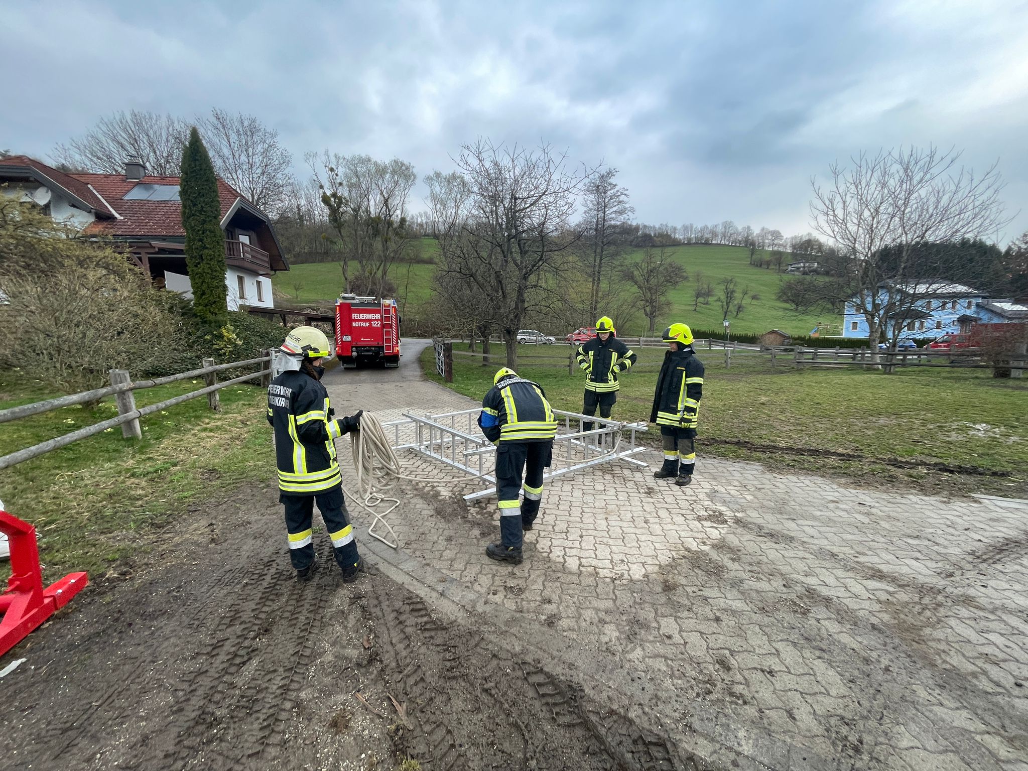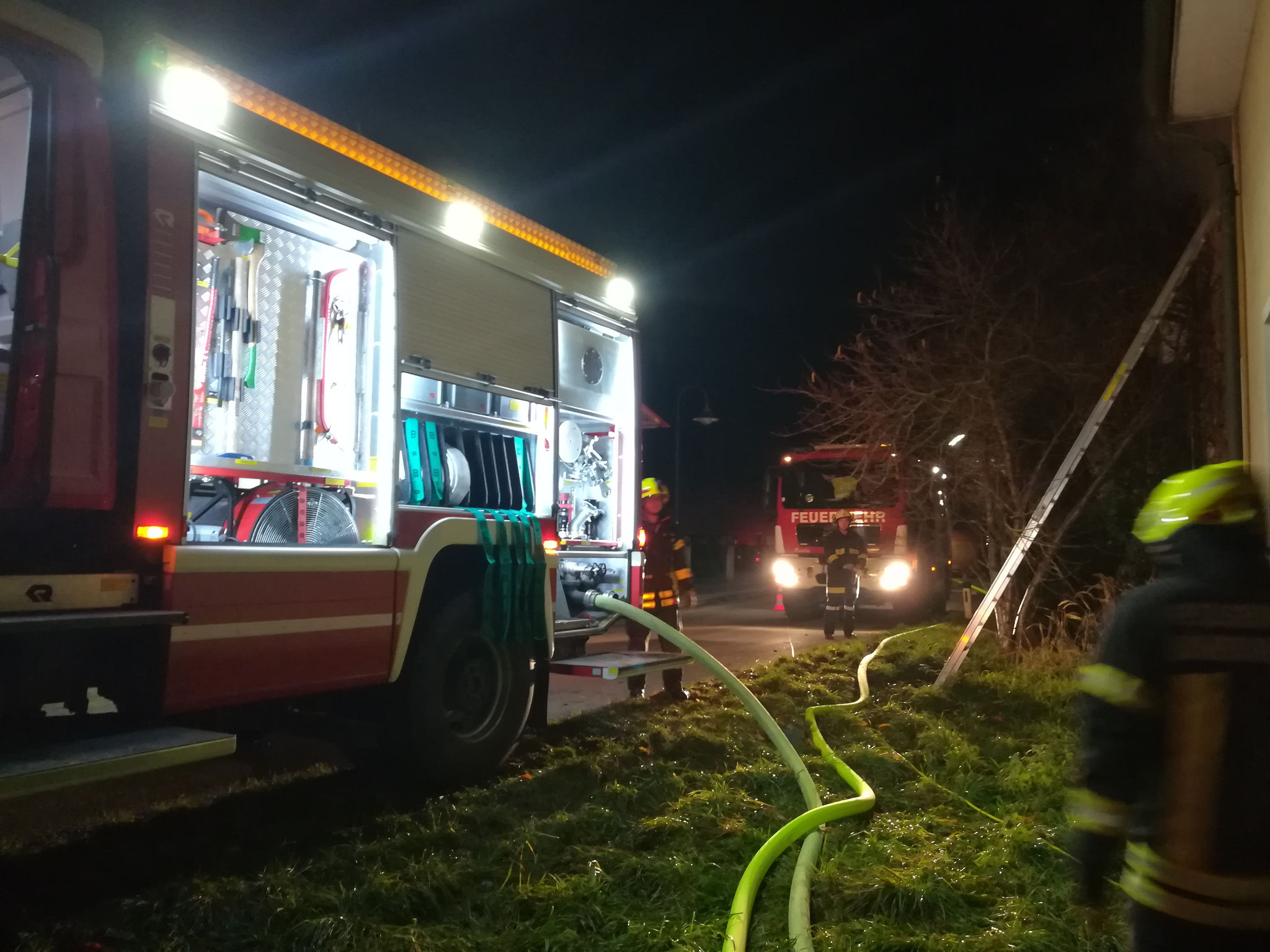 verunfallten Personen wurden über Leitern aus dem 1. Stockwerk gerettet.