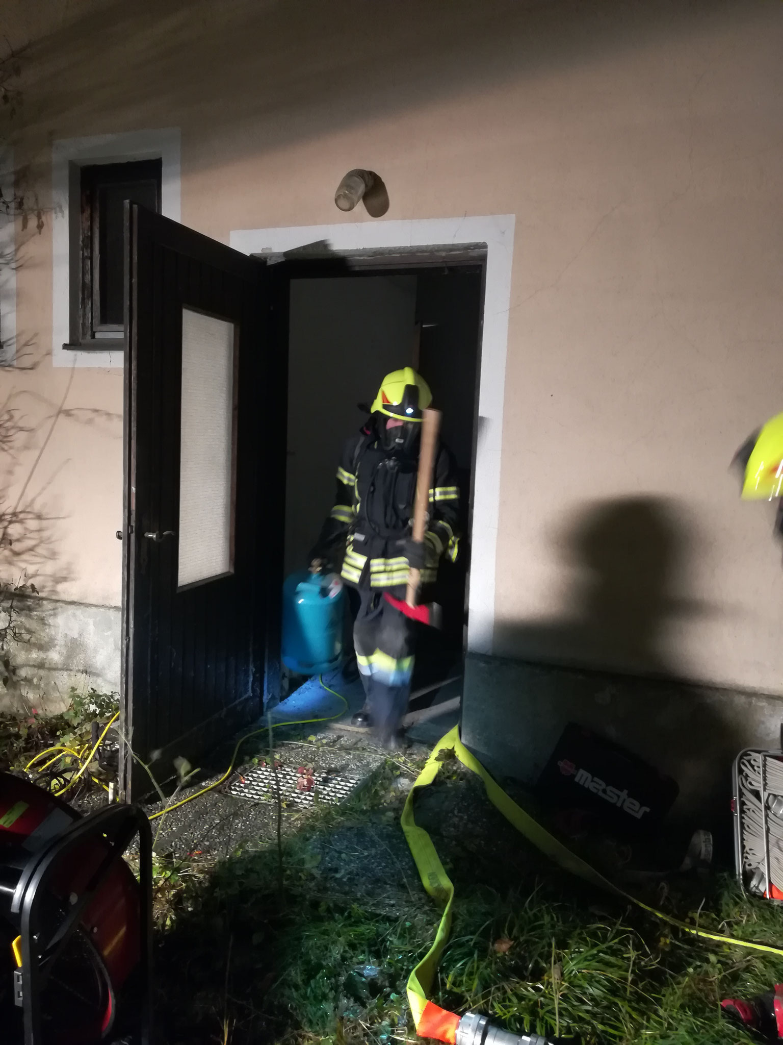 schwerem Atemschutz aus, um die Behälter zu Bergen. Ein großer Behälter war leer und bei zwei kleineren wurde keine Beschädigung festgestellt. Daher konnte der Atemschutzeinsatz wieder beendet