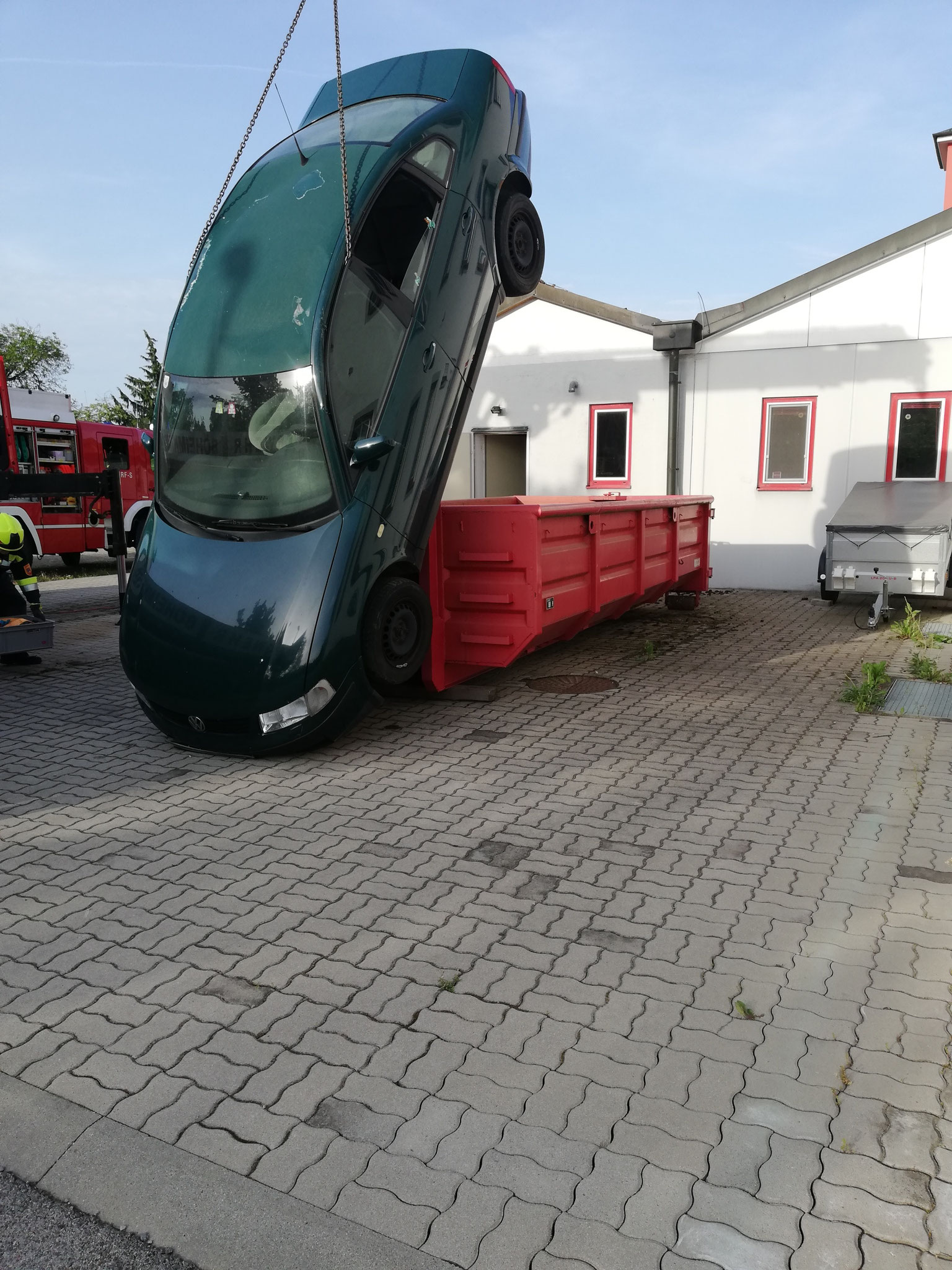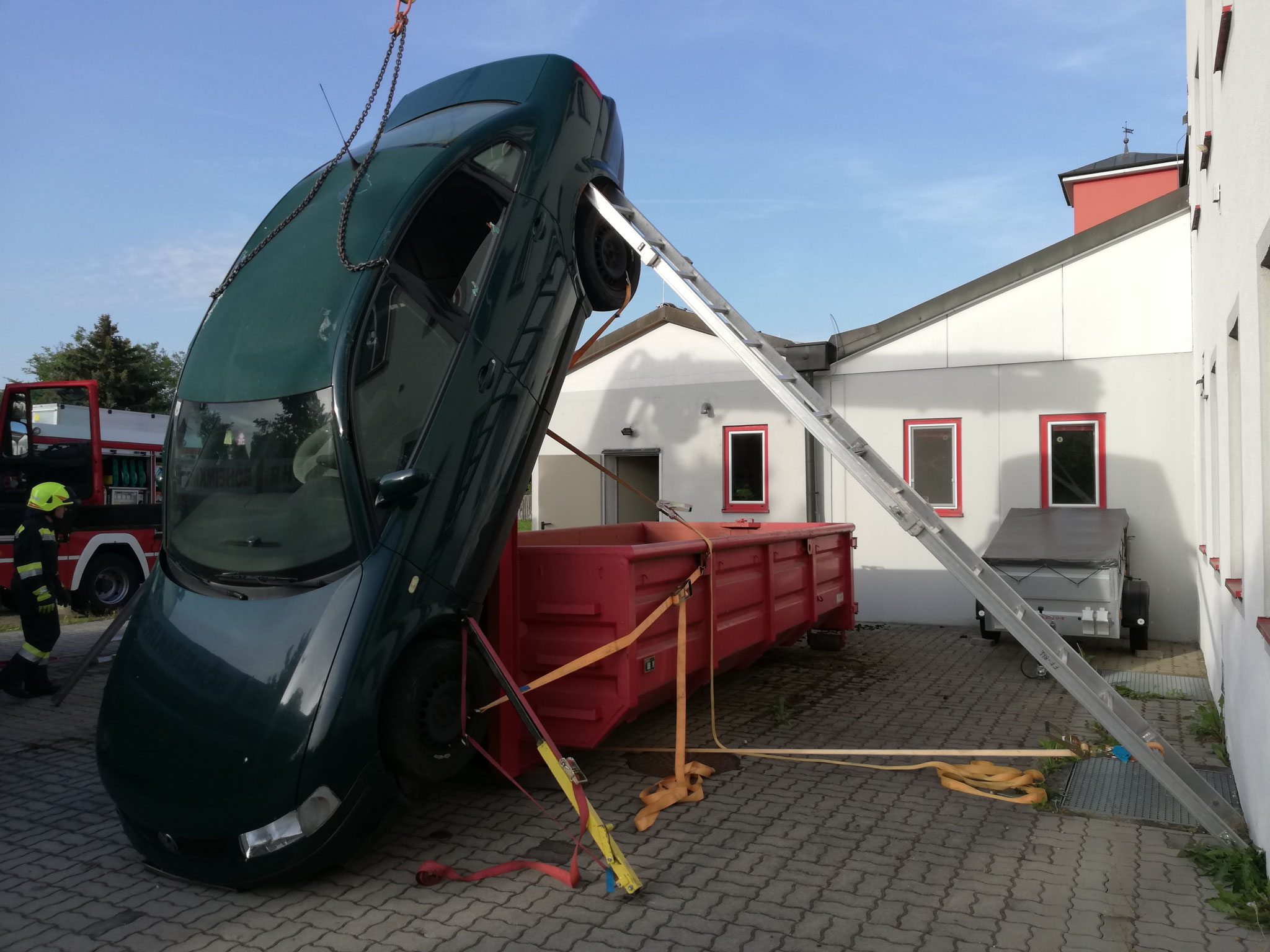 Übungsannahme war ein Verkehrsunfall, bei welchem sich ein Kfz mit einem Fahrer und einer zweiten Person auf der Rückbank überschlug und vertikal, an einer Mulde anlehnend, zur Ruhe kam.