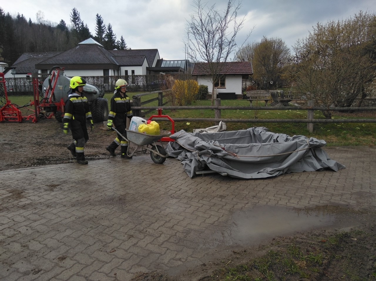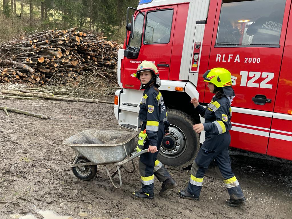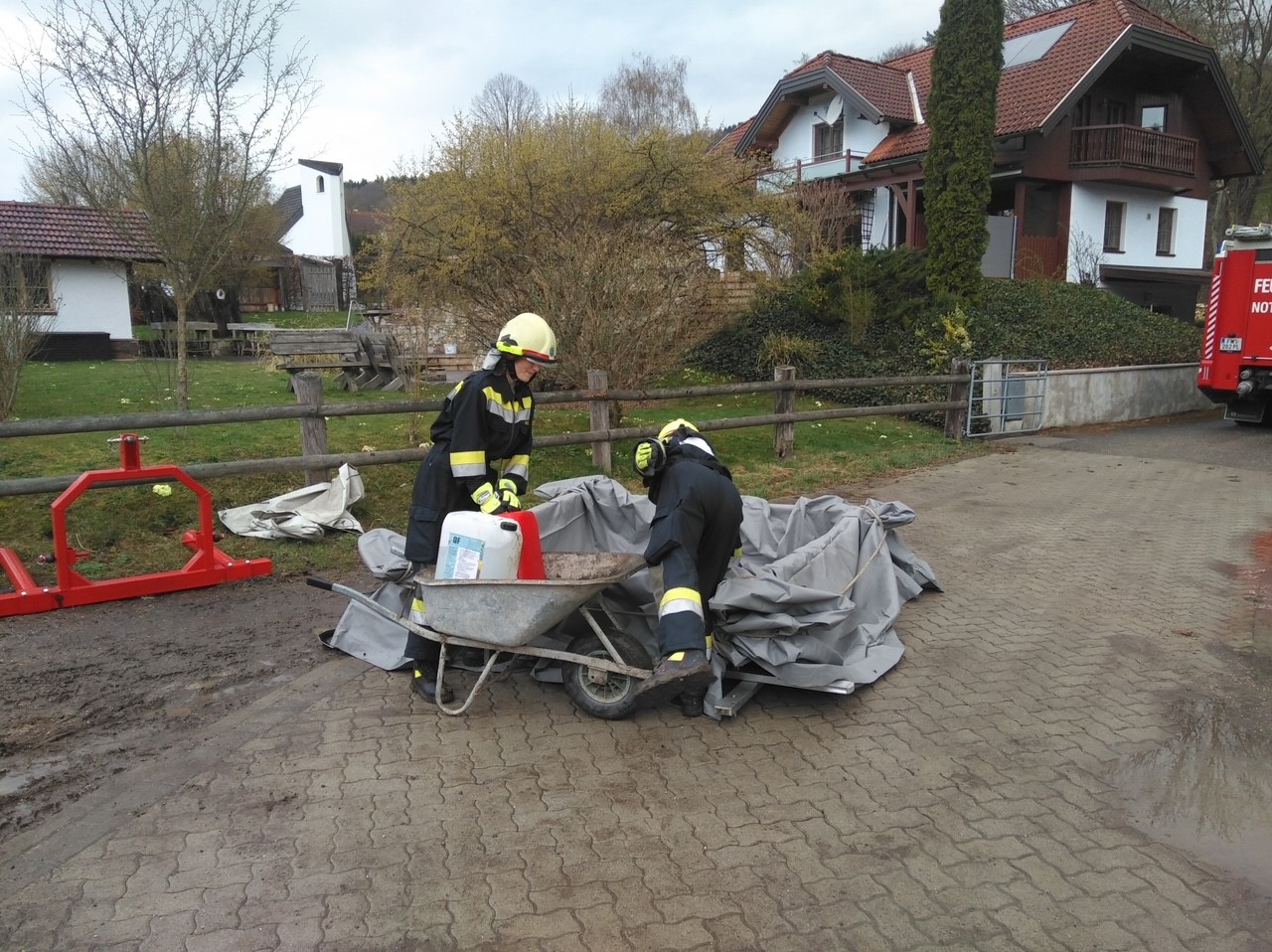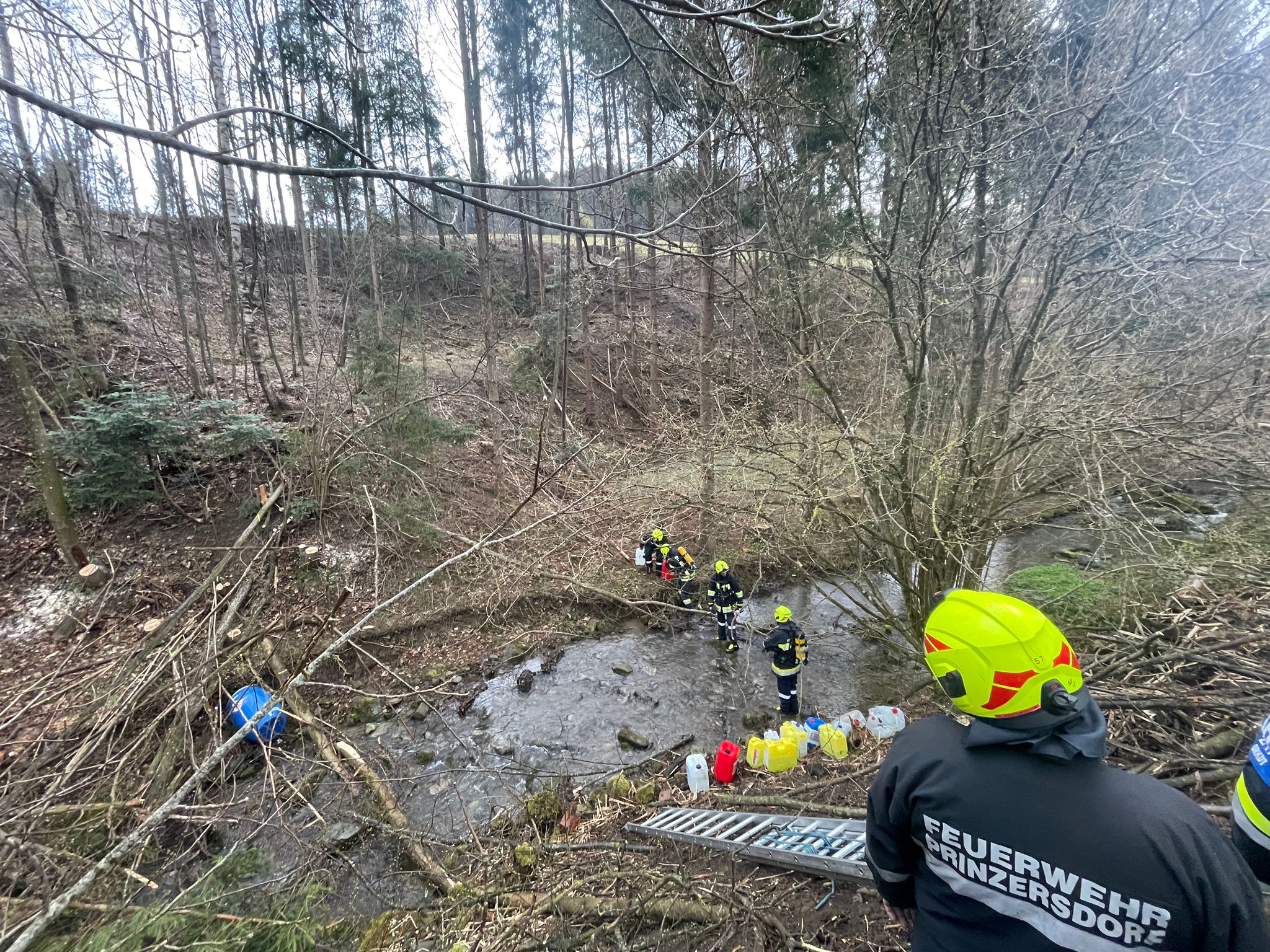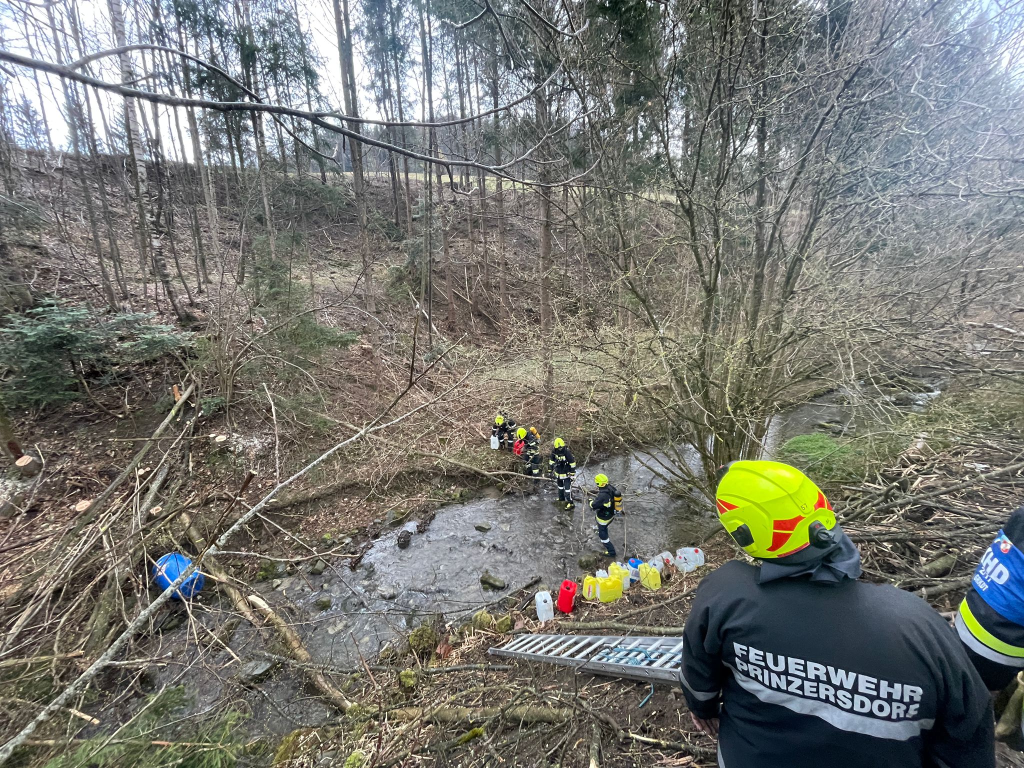 Einsatzbefehl: Bergen von einem großen (rd. 100 kg) und etwa 15 (rd. 20 kg) schweren Schadstoffbehältern sowie das entfernen einer starken Verklausung. Weiters ebenfalls das Aufbauen eines