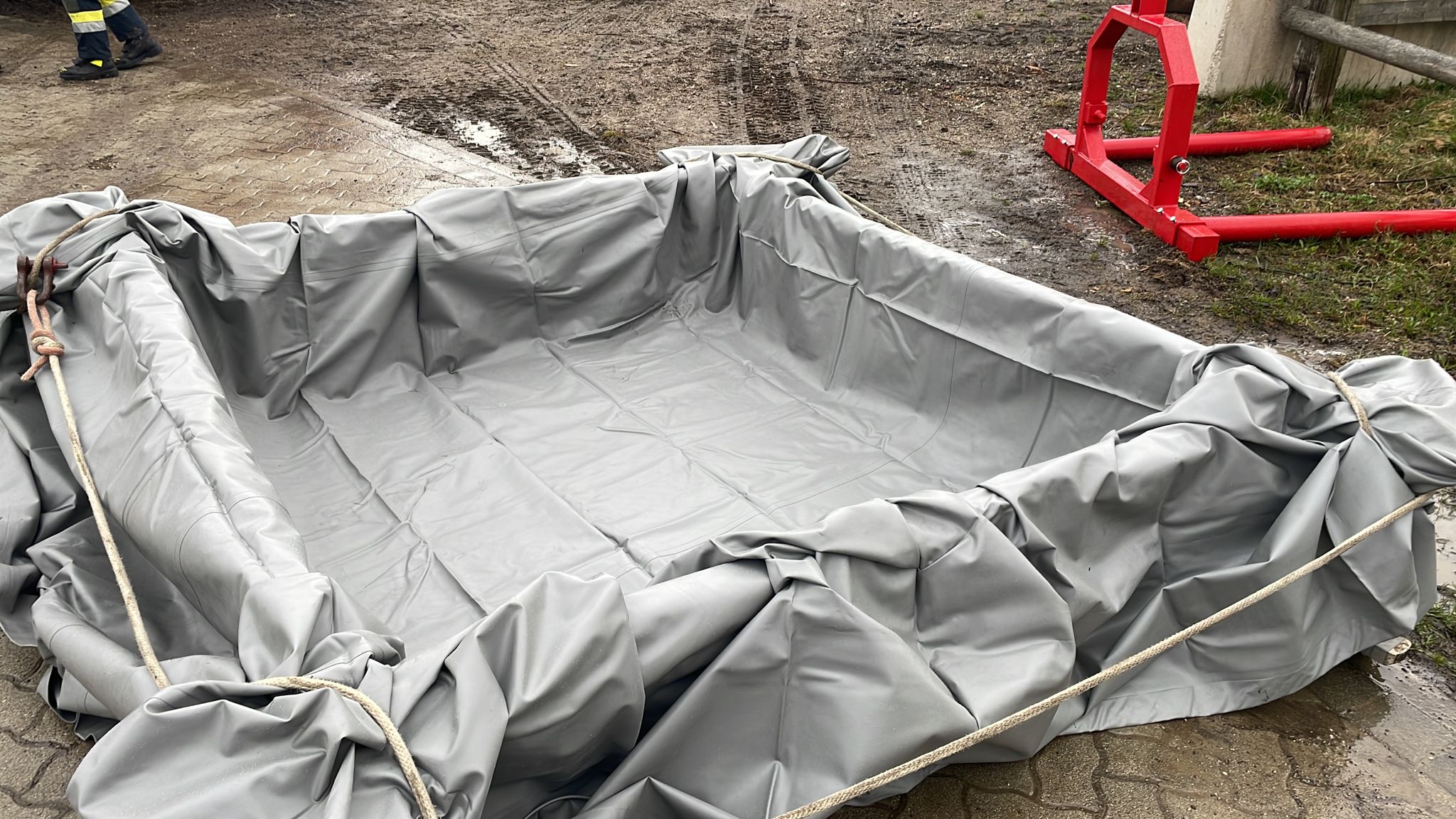 das Aufbauen eines dichten Abstellplatzes für die Behälter sowie Aufbauen eines Dekontaminationsplatzes.