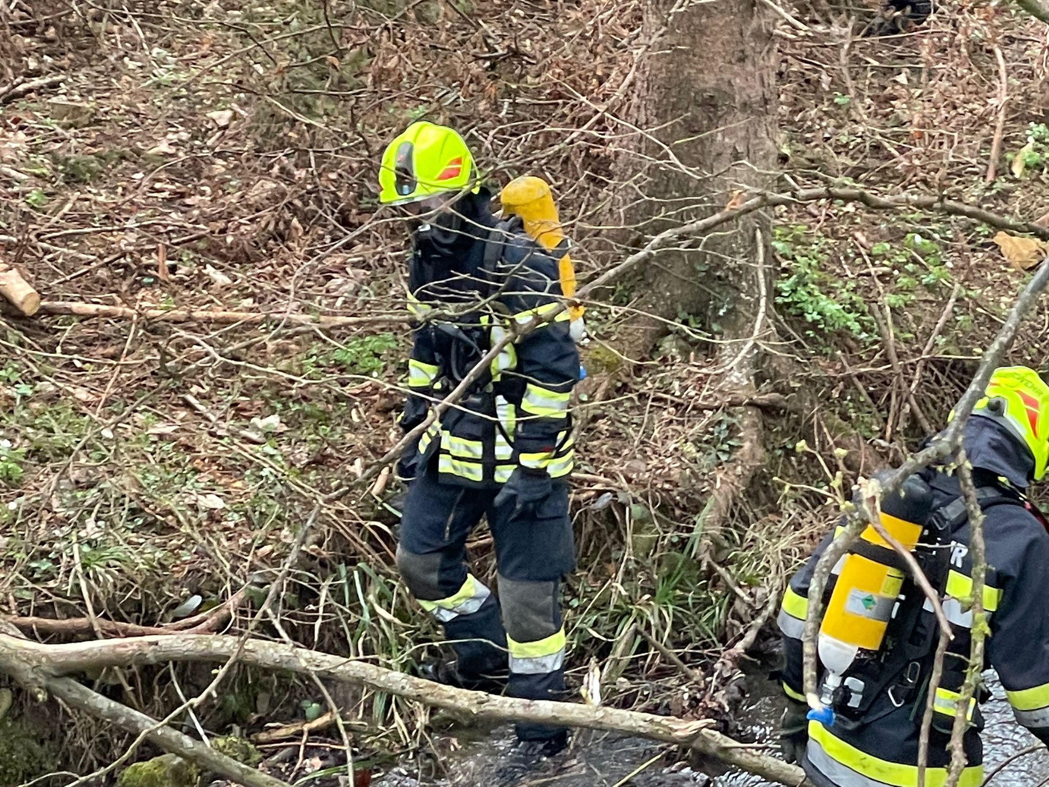 basische organische Stoffe handelt. Die Bergung der Behälter gestaltete sich wegen des steilen und rutschigen Geländes sehr schwierig. Es musste sehr vorsichtig vorgegangen werden, um ein