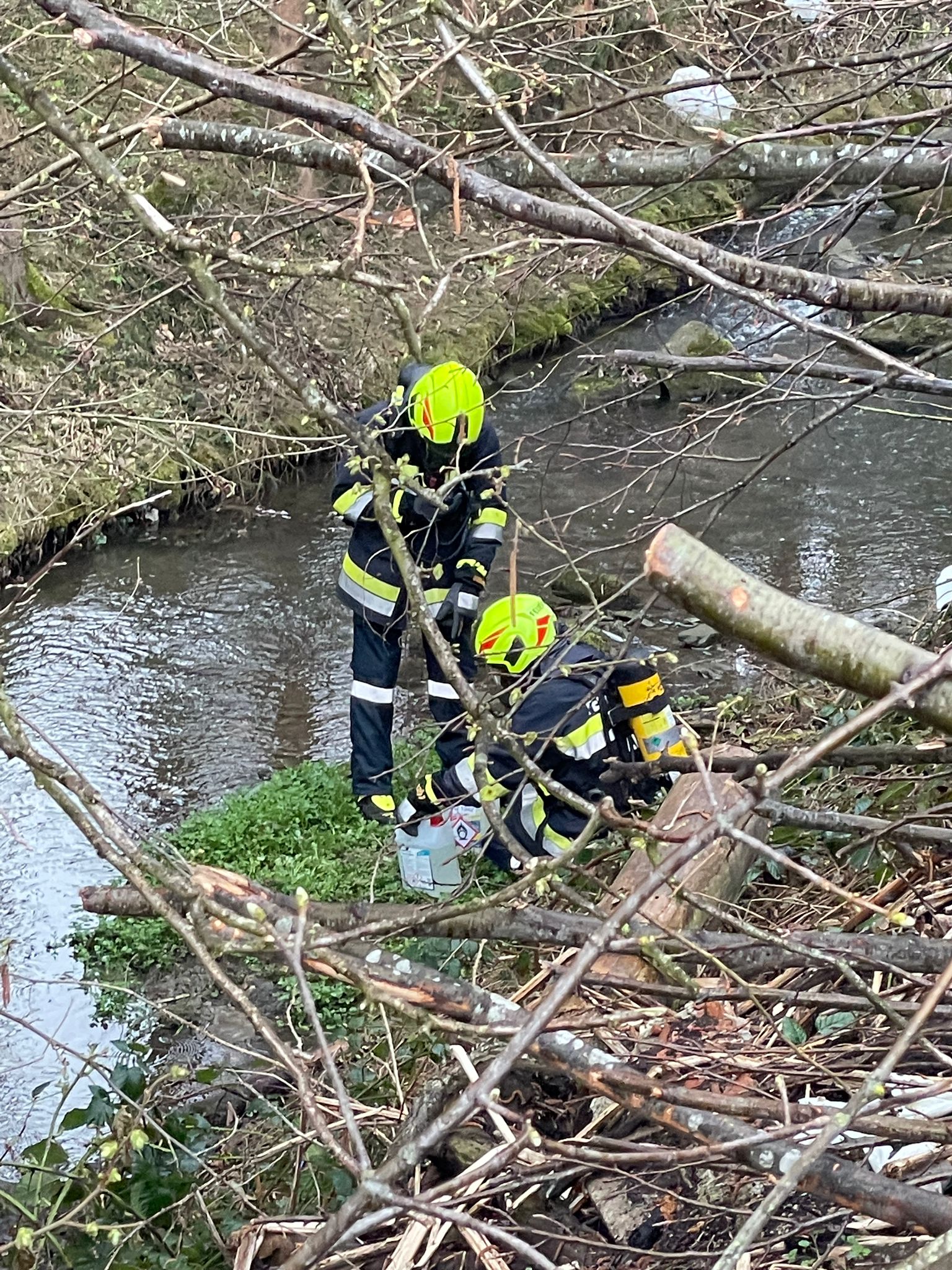 handelt. Während der Aufräumarbeiten der Verklausung wurden auch einige Schadstoffbehälter in dieser gefunden. Da hier nicht klar war, ob diese unbeschädigt waren, rüsteten sich zwei Trupps mit