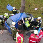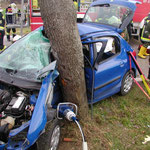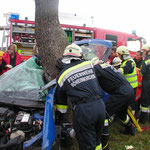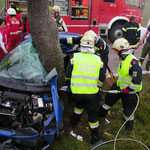 Bei unserem Eintreffen sicherten wir die Unfallstelle ab und begannen sofort mit der Personenrettung. Die Rettung stellte sich als äußerst kinfflig dar, da der Baum den Fußraum des PKWs stark